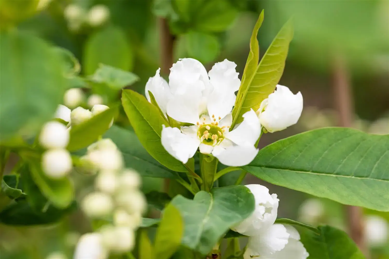 The white flowers of Pearl bush 'Blushing Pearl'(s) appear in clusters from April to May.