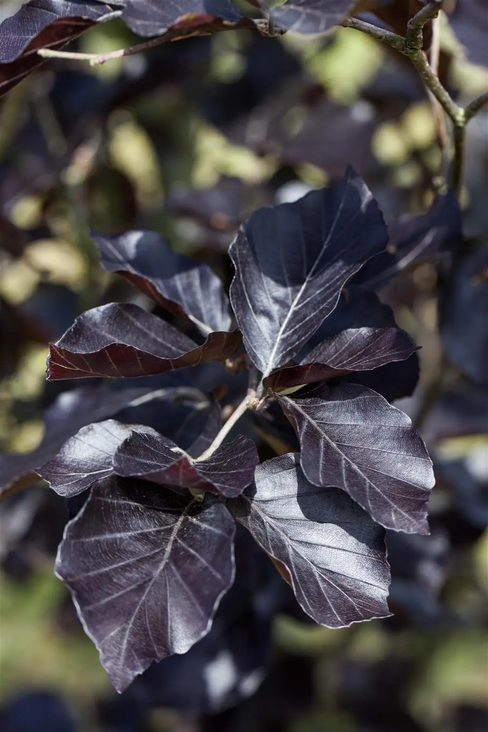 The Common beech 'Dawyck Purple' (Fagus sylvatica) is a columnar, deciduous small tree with decorative, egg-shaped, purple-red leaves. The dark red shoots are also an interesting sight. It also produces brown fruit from September. In a sunny to semi-shady location with well-drained, humus-rich, nutrient-rich soil, it usually reaches a height of approx. 12 metres and grows to a width of approx. 3 metres.