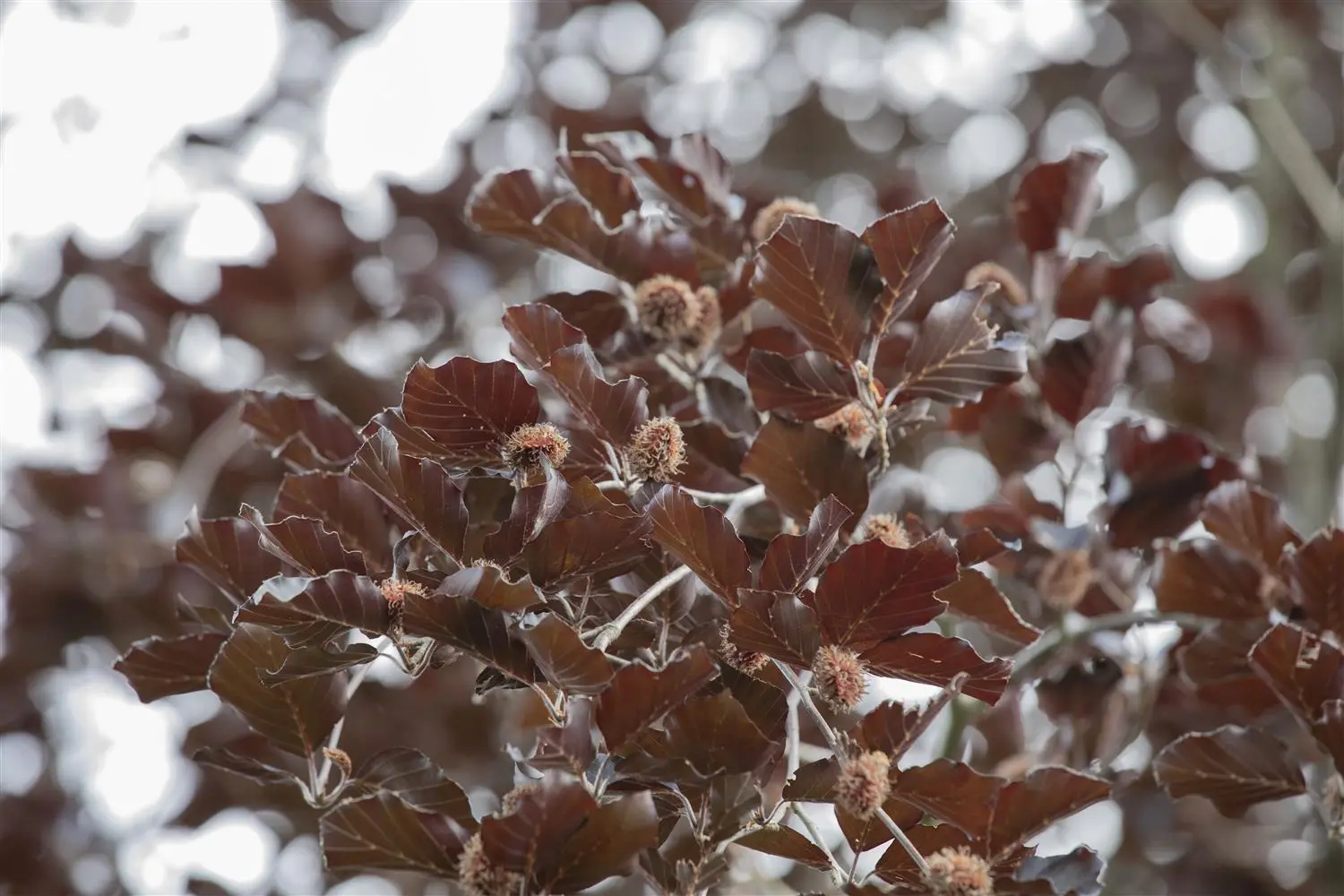 The Common beech 'Purpurea Latifolia' (Fagus sylvatica) is a roundish, deciduous large tree with decorative, egg-shaped, black-red leaves. The dark red shoots are also an interesting sight. It also bears red-yellow flowers in May. These produce brown fruits from September. In a sunny location with well-drained, humus-rich, nutrient-rich soil, it usually reaches a height of around 30 metres and grows to a width of around 30 metres.