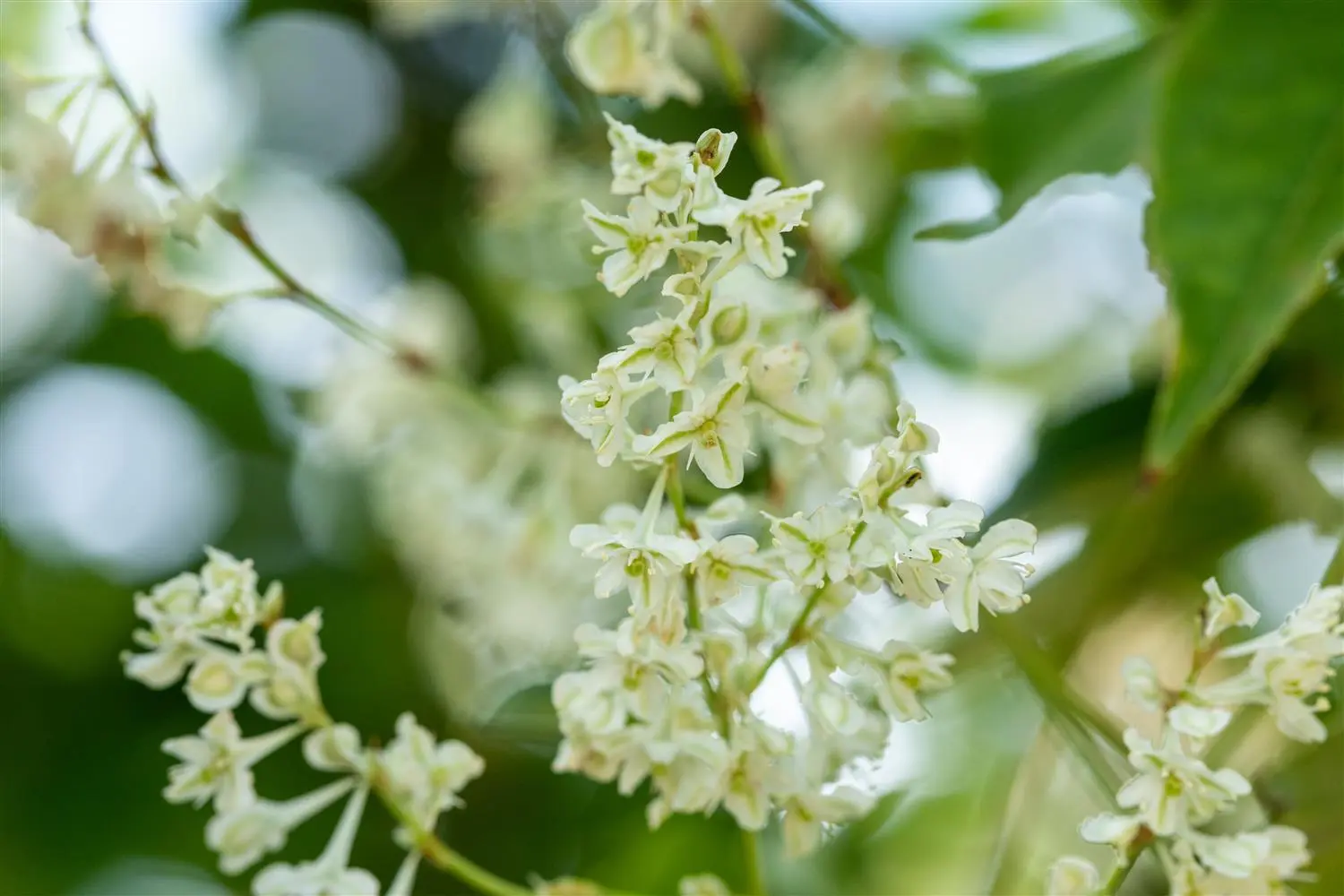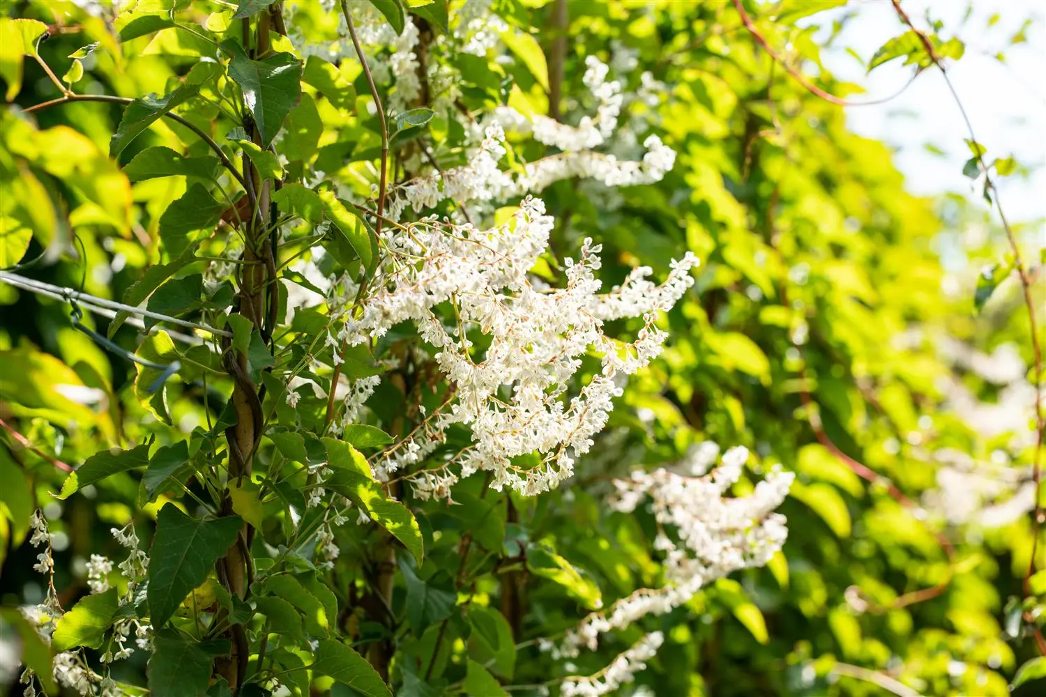 The Mile-a-minute plant (Fallopia aubertii) is a dense, climbing deciduous plant that produces white flowers arranged in panicles. They appear from July to September. The Mile-a-minute plant also has egg-shaped, medium-green leaves. In a sunny to semi-shady location with loose, nutrient-rich soil, it usually reaches a height of around 15 metres and grows to around 6 metres wide.