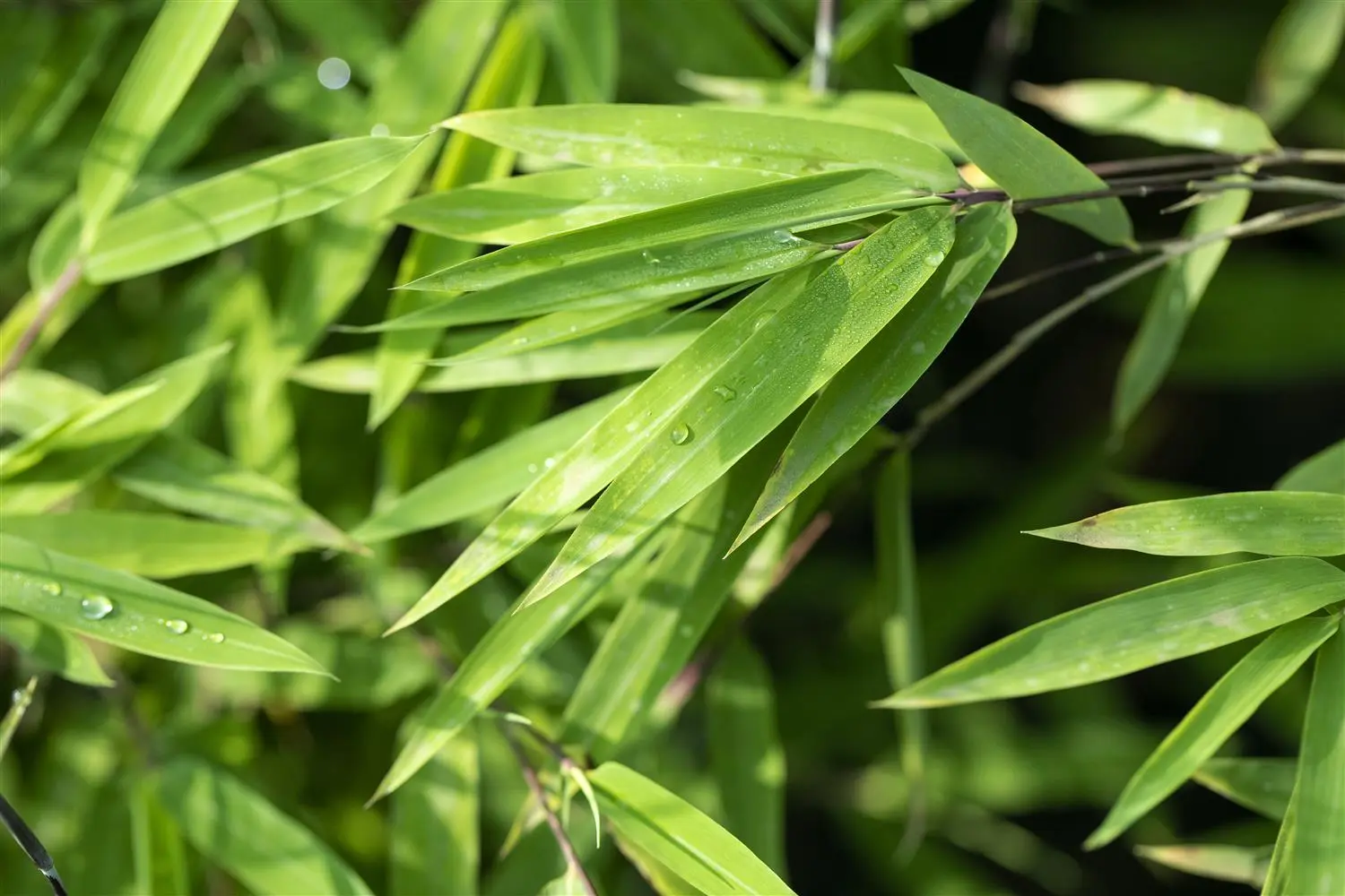The evergreen leaves of Fountain bamboo 'Black Pearl' are dark green, lanceolate.