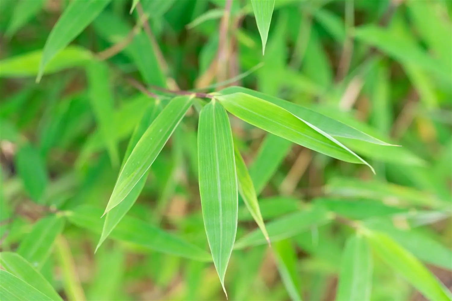 The evergreen leaves of Fountain bamboo 'Winter Joy' are light green, lanceolate.