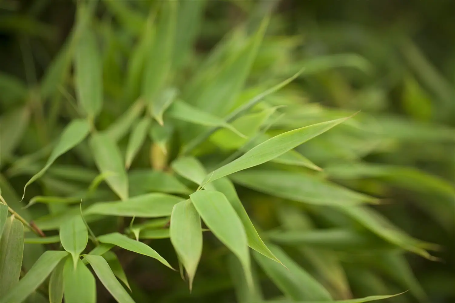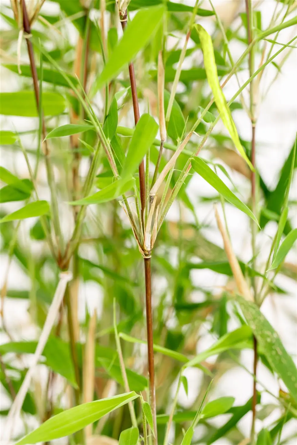 The wintergreen leaves of the Umbrella bamboo 'Obelisk'® are dark green, lanceolate.