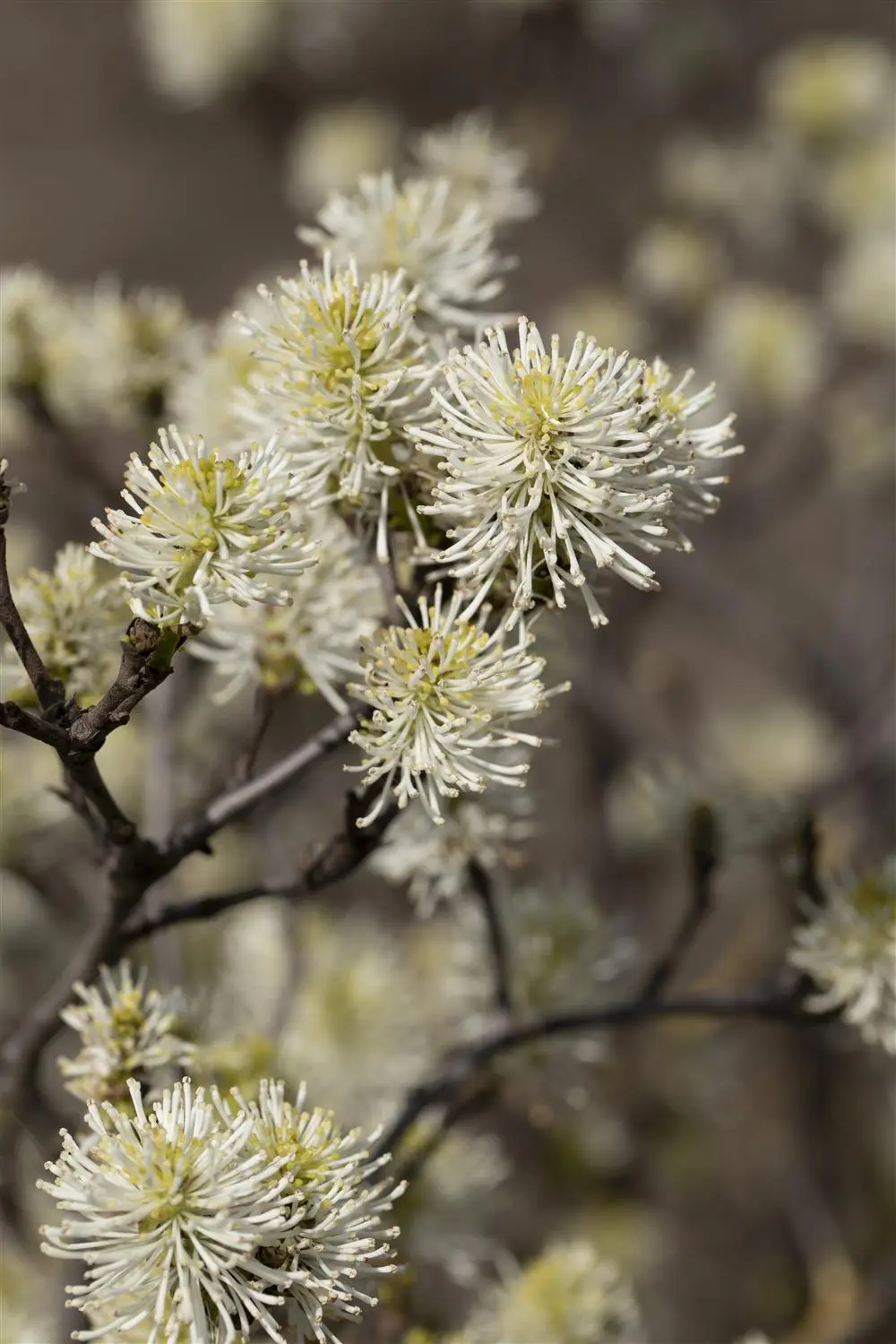 The Mountain witch alder (Fothergilla major) is a bushy, upright shrub that produces white flowers arranged in spikes with a strong fragrance. They appear in May. Green capsules emerge from these. They exude a strong fragrance. The Mountain witch alder also has egg-shaped, medium green leaves. In a sunny to semi-shady, wind-protected location with humusy, sandy, acidic soil, it usually reaches a height of around 3 metres and grows to around 2 metres wide.