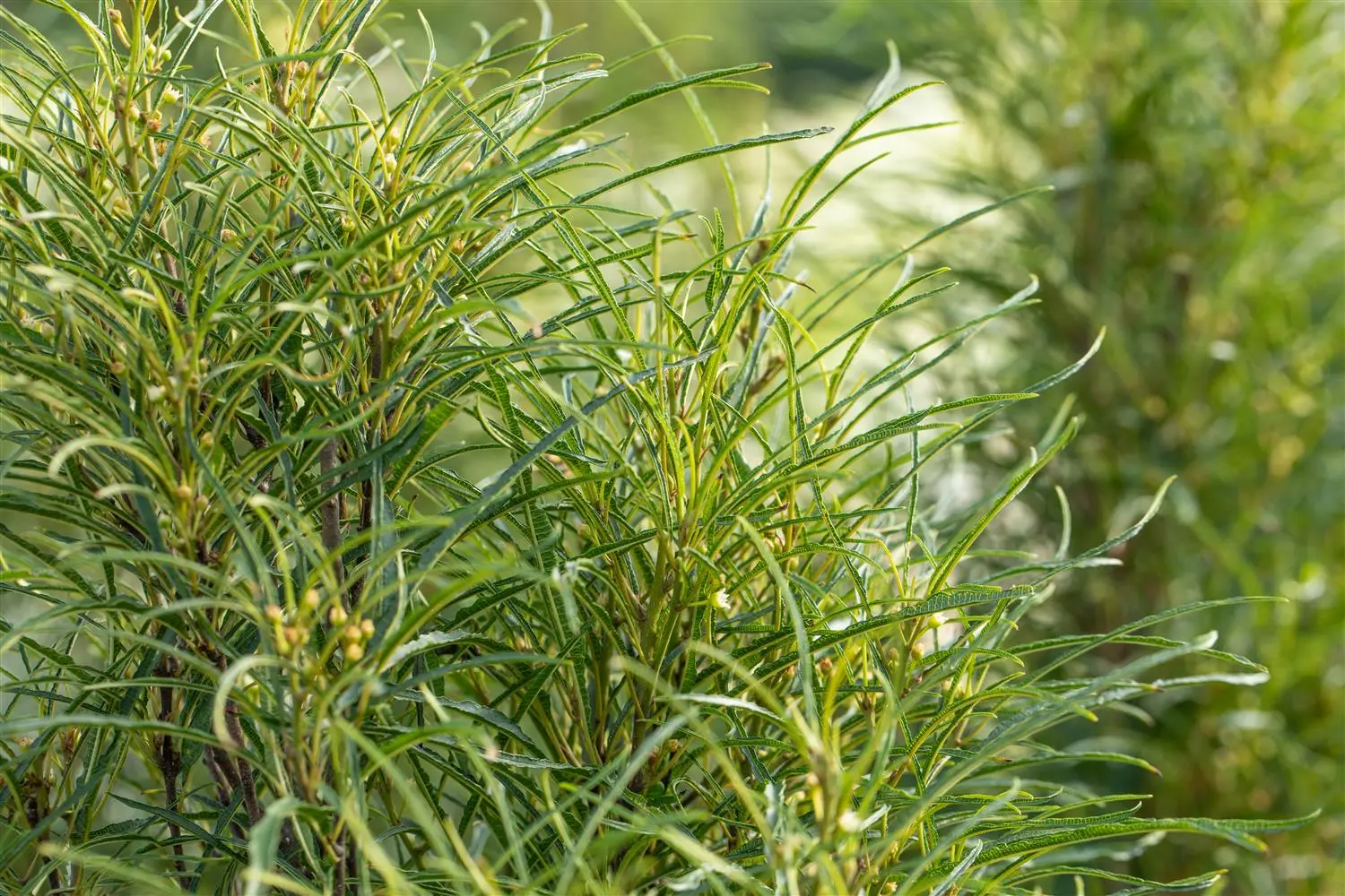 High leaf ornamental value. The deciduous leaves of the Alder buckthorn 'Fine Line'®s are medium green, lanceolate, glossy, alternate. They are about 10 - 15 cm in size. Alder buckthorn 'Fine Line'® is bright golden yellow in autumn.