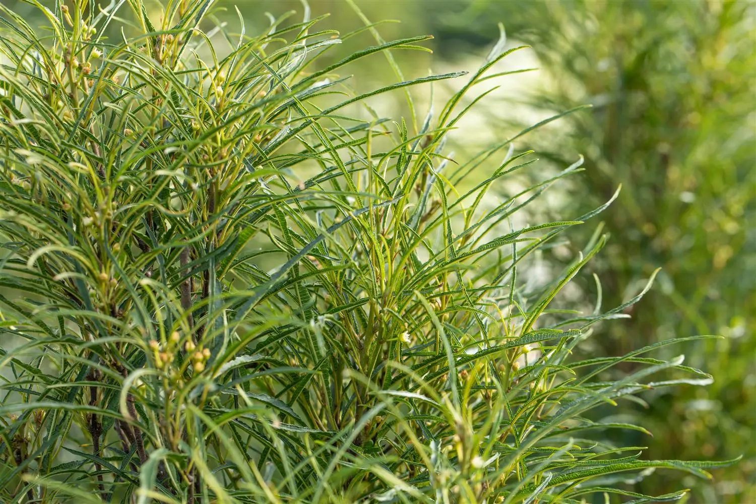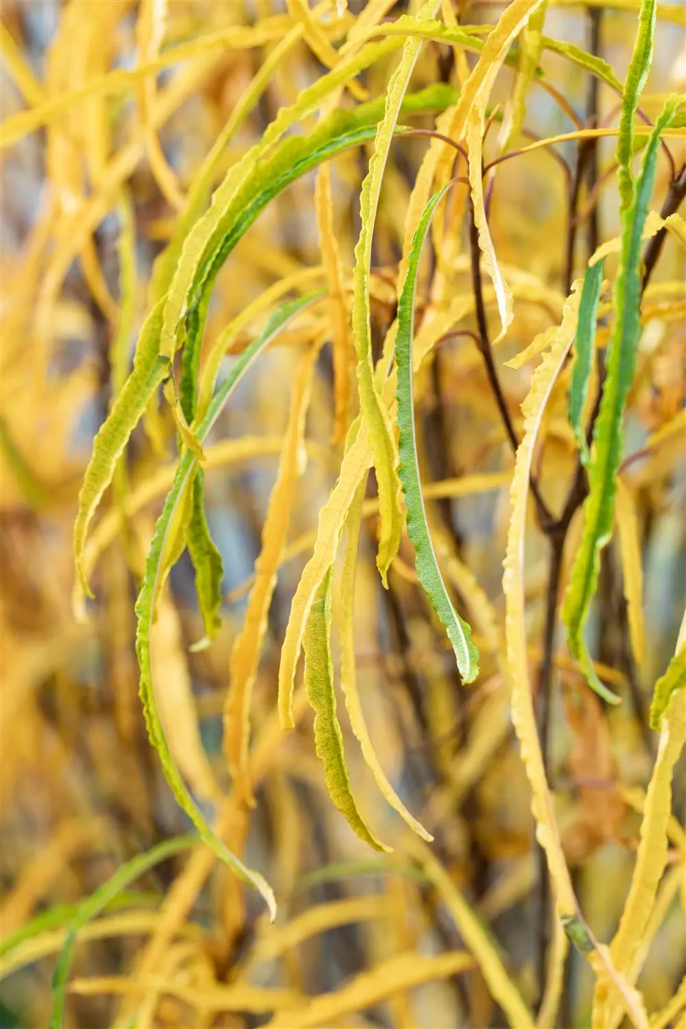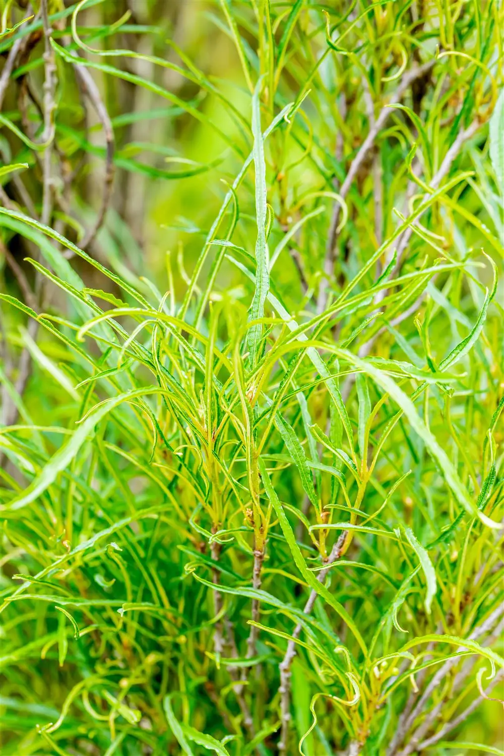 High leaf ornamental value. The deciduous leaves of the Alder buckthorn 'Fine Line'®s are medium green, lanceolate, glossy, alternate. They are about 10 - 15 cm in size. Alder buckthorn 'Fine Line'® is bright golden yellow in autumn.