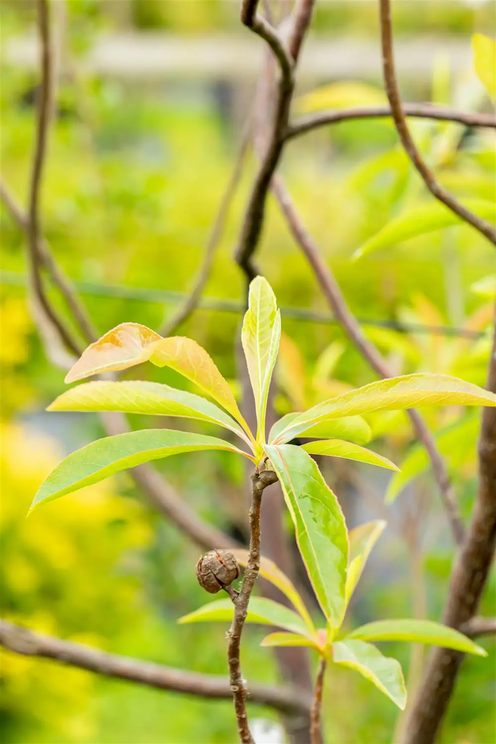 The Franklin tree (Franklinia alatamaha) is a sprawling large shrub that produces white, cupped flowers with a strong fragrance. They appear from September to October. The Franklin tree also has shiny, lanceolate, dark green leaves. In a sunny to semi-shady, wind-protected location with humusy, sandy, acidic, weakly acidic soil, it usually reaches a height of approx. 8 metres and grows to a width of approx. 4.5 metres.