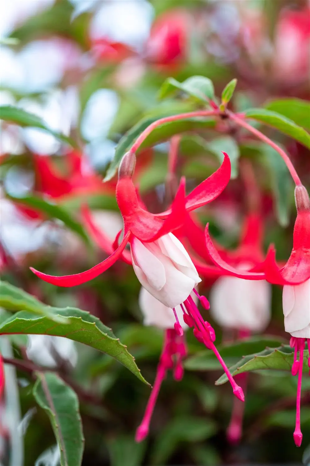 The Lady's eardrops 'Madame Cornelissen' (Fuchsia magellanica) is a shrub-like perennial that produces red-white, bell-shaped flowers from July to October. Its egg-shaped leaves are dark green. In a sunny to semi-shady, wind-protected location with well-drained, nutrient-rich soil, it usually reaches a height of approx. 80 cm and is approx. 40 cm wide. The Lady's eardrops 'Madame Cornelissen' is well tolerant of frost.