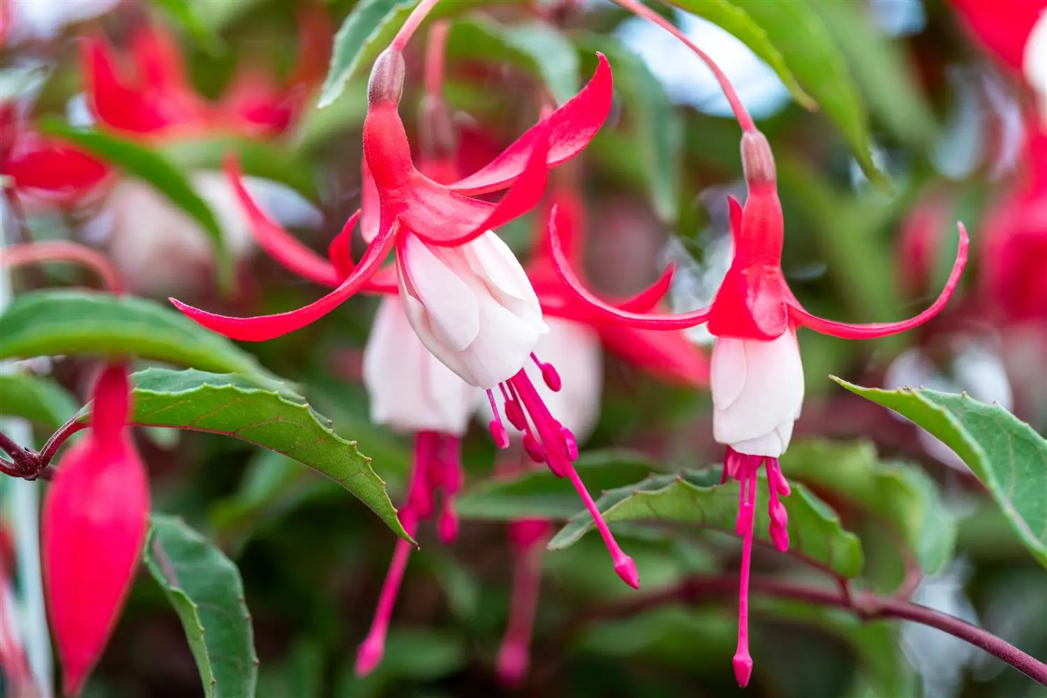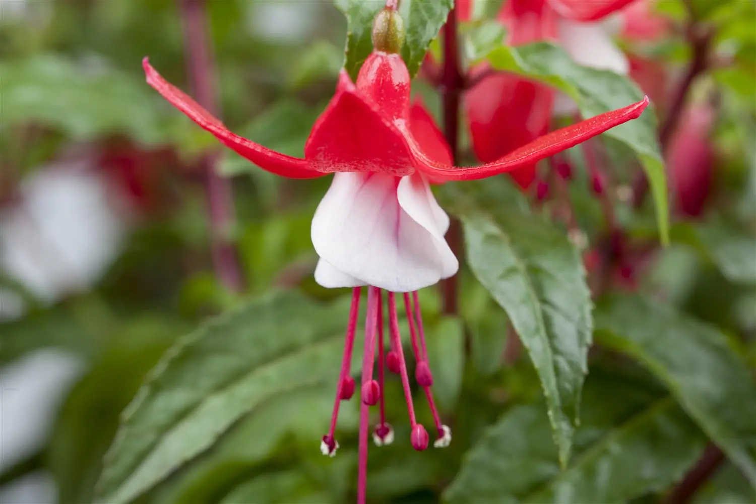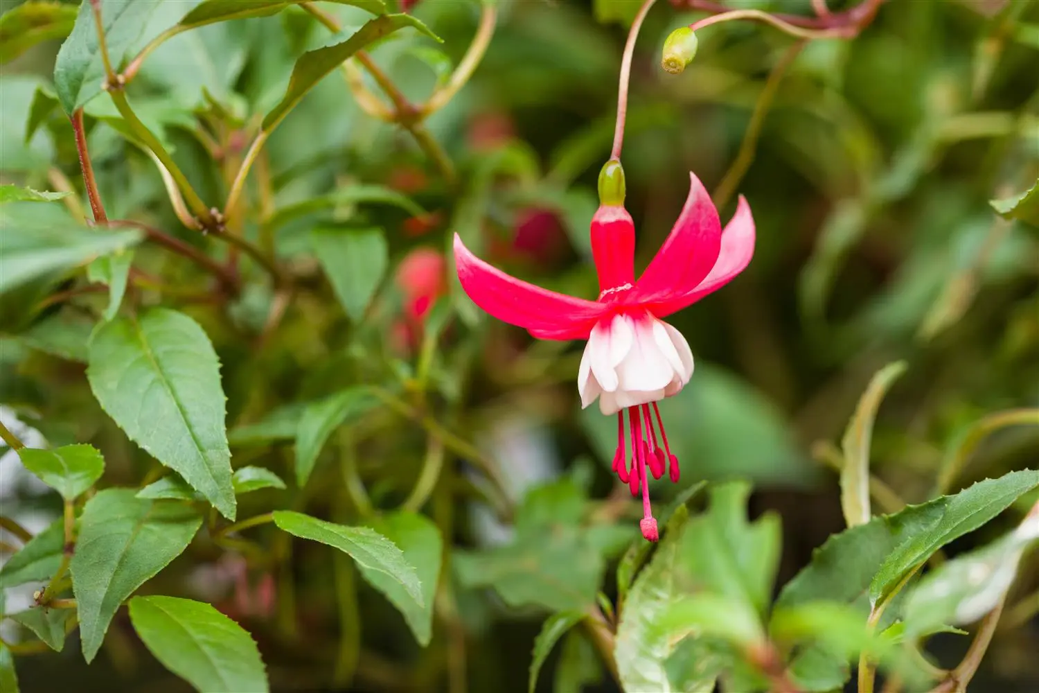 Fuchsia magellanica 'Madame Cornelissen' forms bell-shaped, red-white flowers from July.
