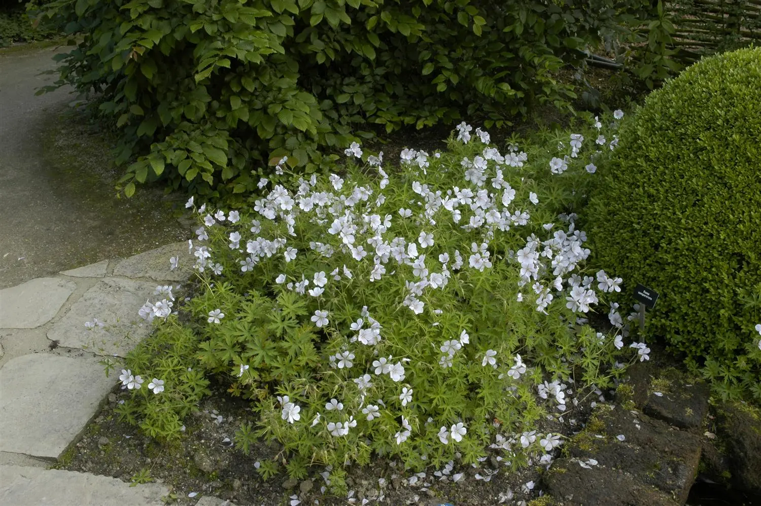 The Cranesbill 'Kashmir White' has good frost hardiness.
