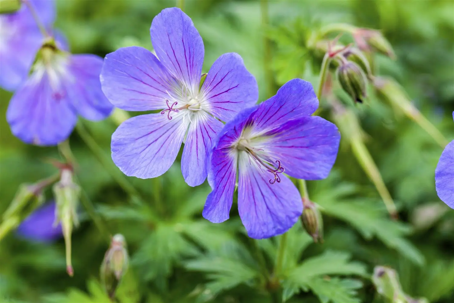 The Meadow cranesbill (Geranium pratense) is a clump-forming, loose perennial that produces purple, cup-shaped flowers from June to September. Its fingered leaves are medium green. In a sunny to semi-shady location, it usually reaches a height of approx. 70 cm and is approx. 50 cm wide. The Meadow cranesbill makes no particular demands on the soil. The Meadow cranesbill is well tolerant of frost.