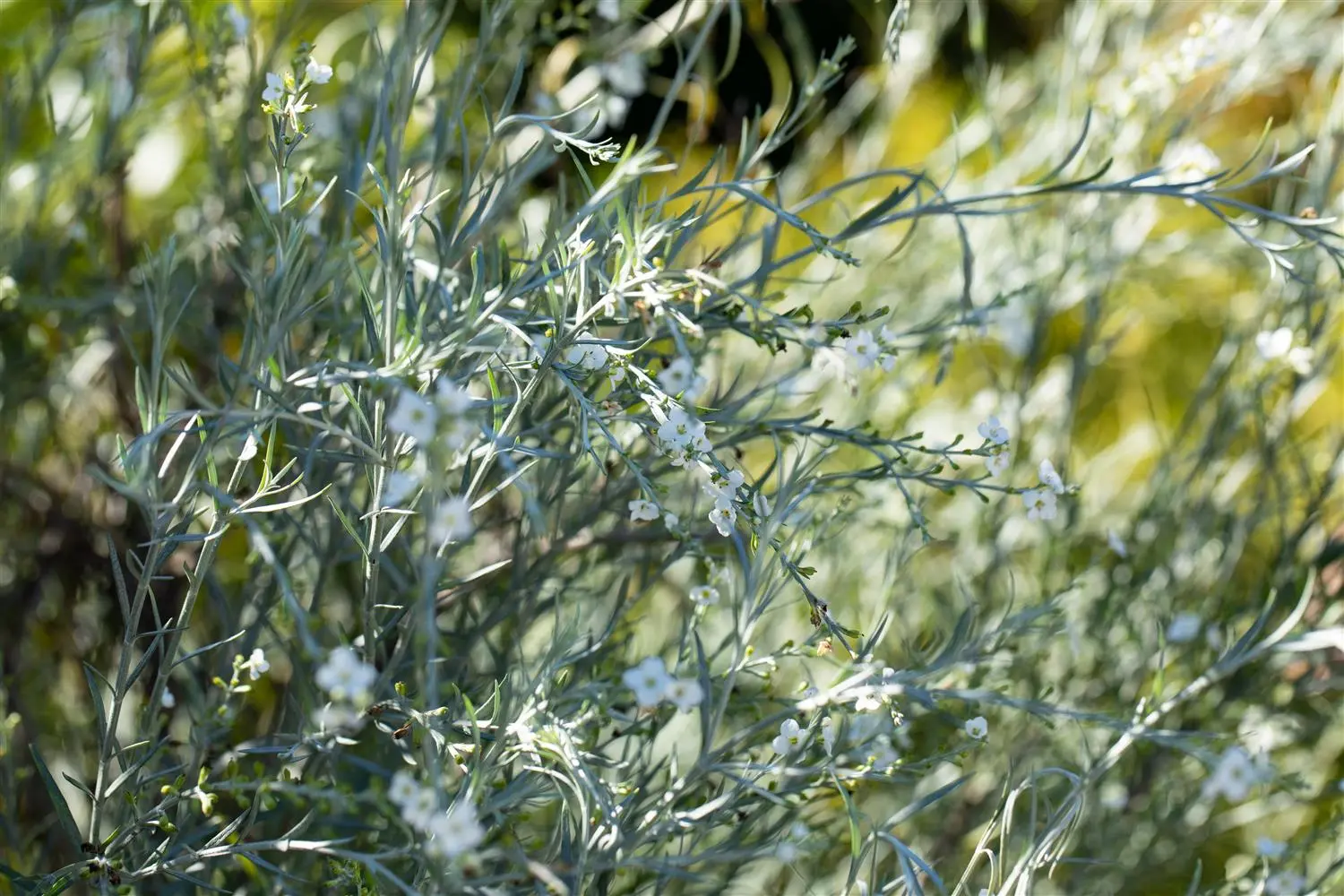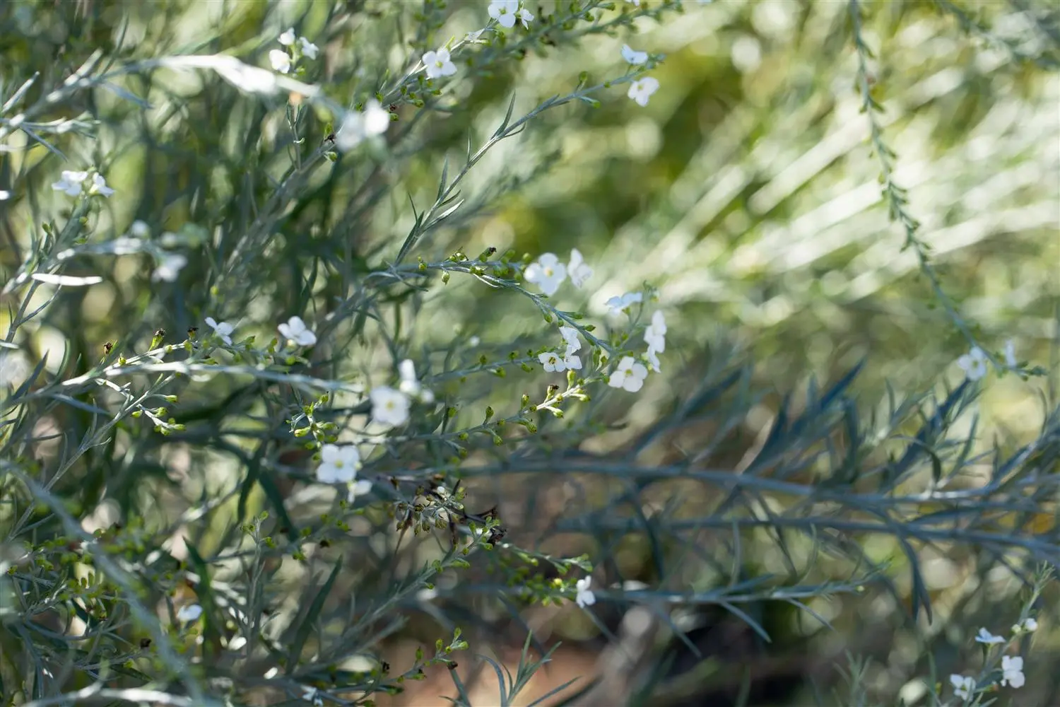 The winter-green leaves of the Otter bush are grey-green, needle-shaped.