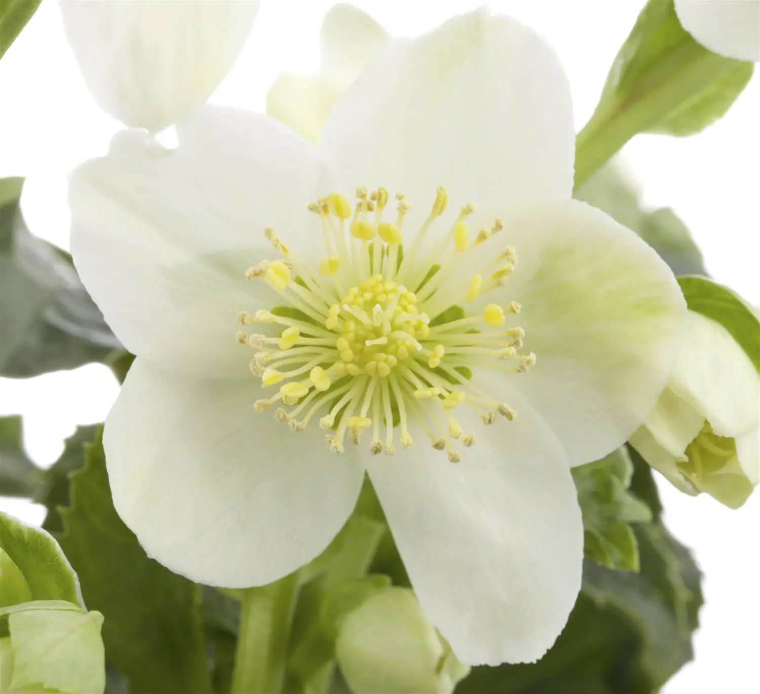 The Christmas rose (Helleborus x ericsmithii) is a bushy, upright, winter-green perennial with decorative, fingered, dark green leaves. It bears white, later pink-coloured flowers from December to February. In a semi-shady location with well-drained, humus-rich soil, it usually grows to a height of approx. 40 cm and is approx. 40 cm wide. The Christmas rose is well tolerant of frost.