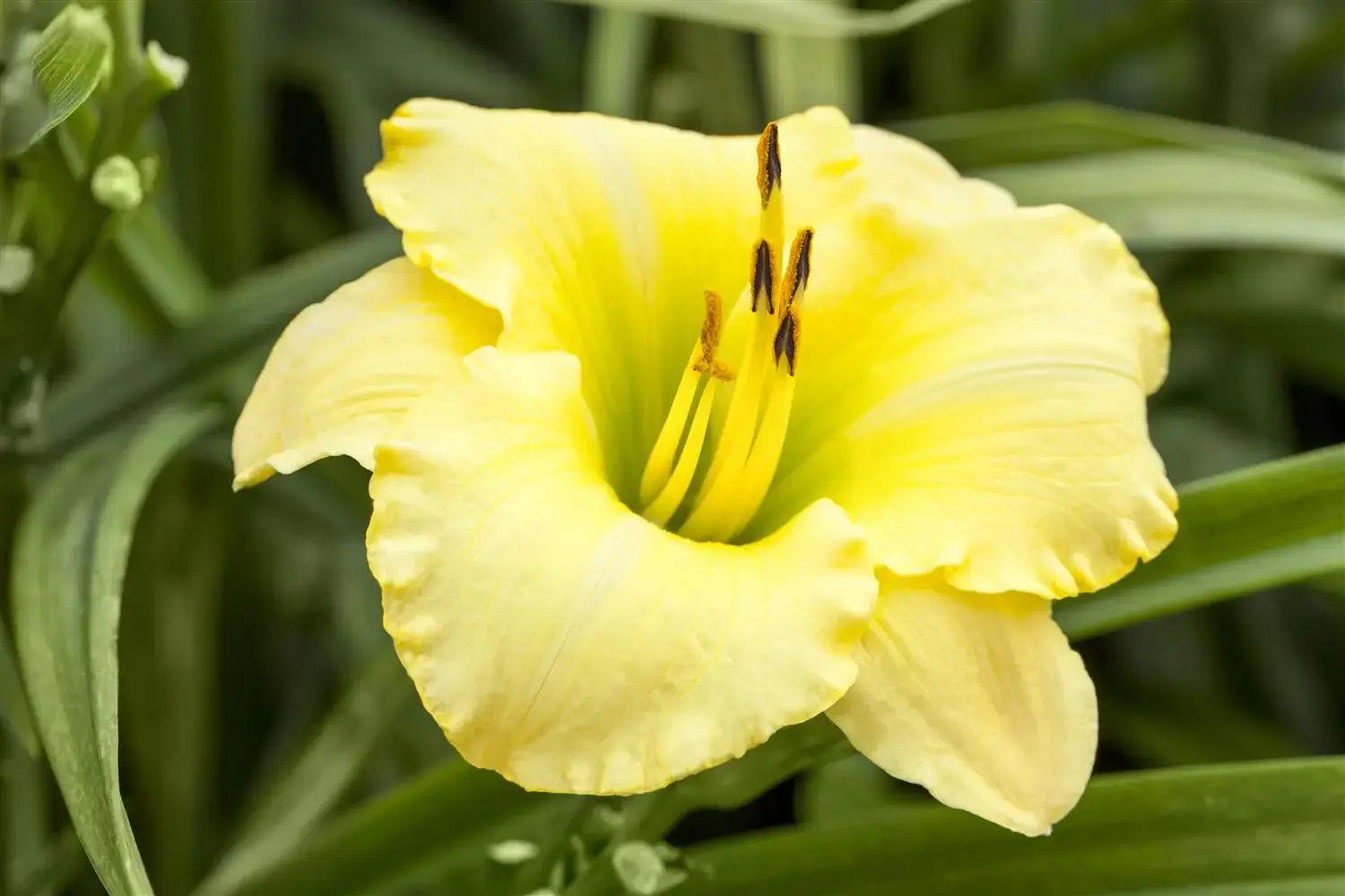 Hemerocallis 'Big Time Happy' forms funnel-shaped, lemon-yellow flowers from June.