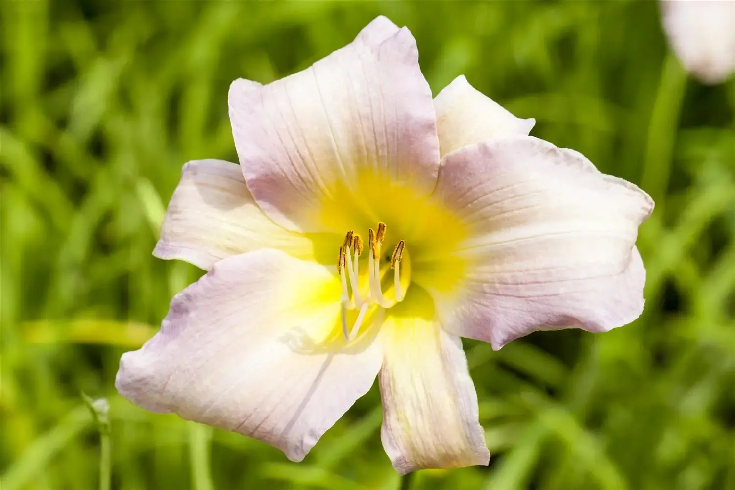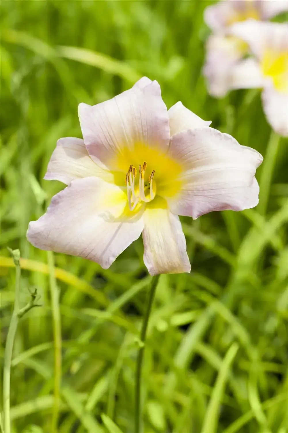 Hemerocallis 'Catherine Woodberry' forms funnel-shaped, light pink-coloured flowers from July.