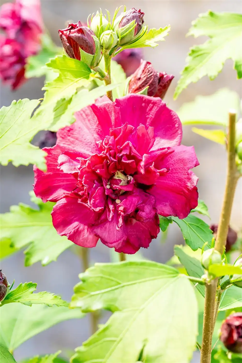 Rose of Sharon 'French Cabaret® Red' is an upright and bushy growing shrub. It usually reaches a height of 2.5 - 3 m and is approx. 1 - 2 m wide. It usually grows 10 - 25 cm per year.
