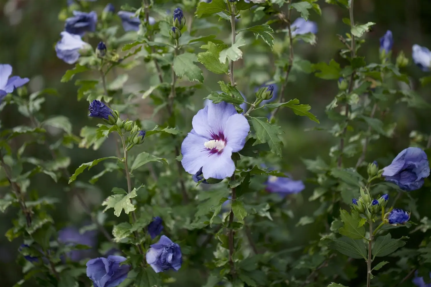 The Rose of Sharon 'Oiseau Bleu' (Hibiscus syriacus) is an upright shrub that produces blue, cup-shaped flowers. They appear from July to September. The Rose of Sharon 'Oiseau Bleu' also has egg-shaped, medium green leaves. In a sunny to semi-shady, wind-protected location with well-drained, nutrient-rich soil, it usually reaches a height of around 3 metres and grows to around 1.5 metres wide.