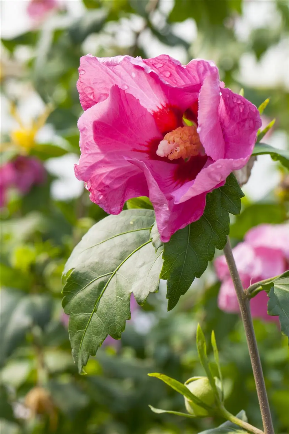 The Rose of Sharon 'Pink Giant'® (Hibiscus syriacus) is an upright, shrub-like shrub that produces pink-coloured, cup-shaped flowers. They appear from July to September. The Rose of Sharon 'Pink Giant'® also has egg-shaped, medium green leaves. In a sunny to semi-shady, wind-protected location with well-drained, nutrient-rich soil, it usually reaches a height of around 3 metres and grows to around 1.5 metres wide.