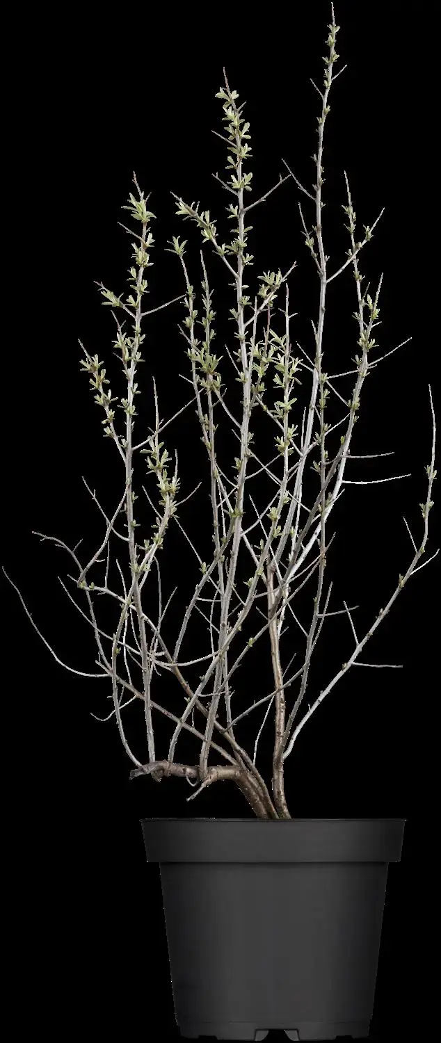 Sea buckthorn is a sprawling large shrub that can reach a height of 3 - 6 metres and a width of 2 - 3 metres. It usually grows 20 - 30 cm per year.
