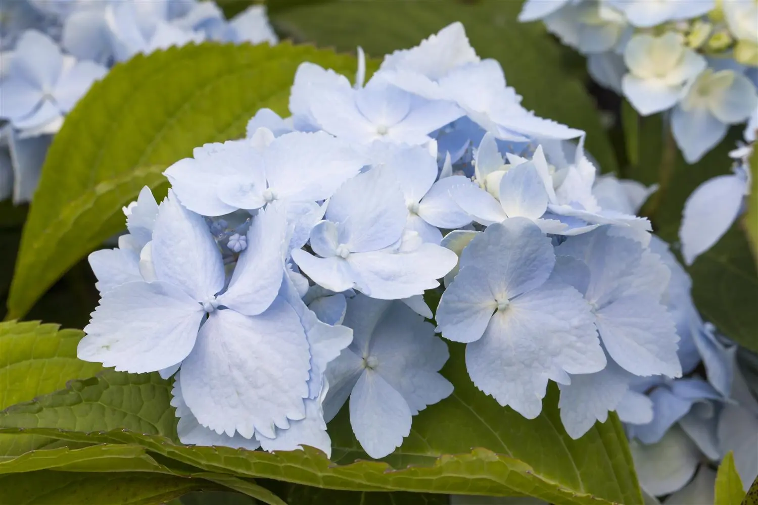 The Saw-toothed hydrangea 'Blue Deckle' (Hydrangea serrata) is a broad, compact small shrub that produces light blue flowers. They appear from July to October. The Saw-toothed hydrangea 'Blue Deckle' also has lanceolate, medium green leaves. In a sunny to semi-shady location with well-drained, nutrient-rich soil, it usually reaches a height of approx. 1.2 metres and grows to a width of approx. 1.5 metres.