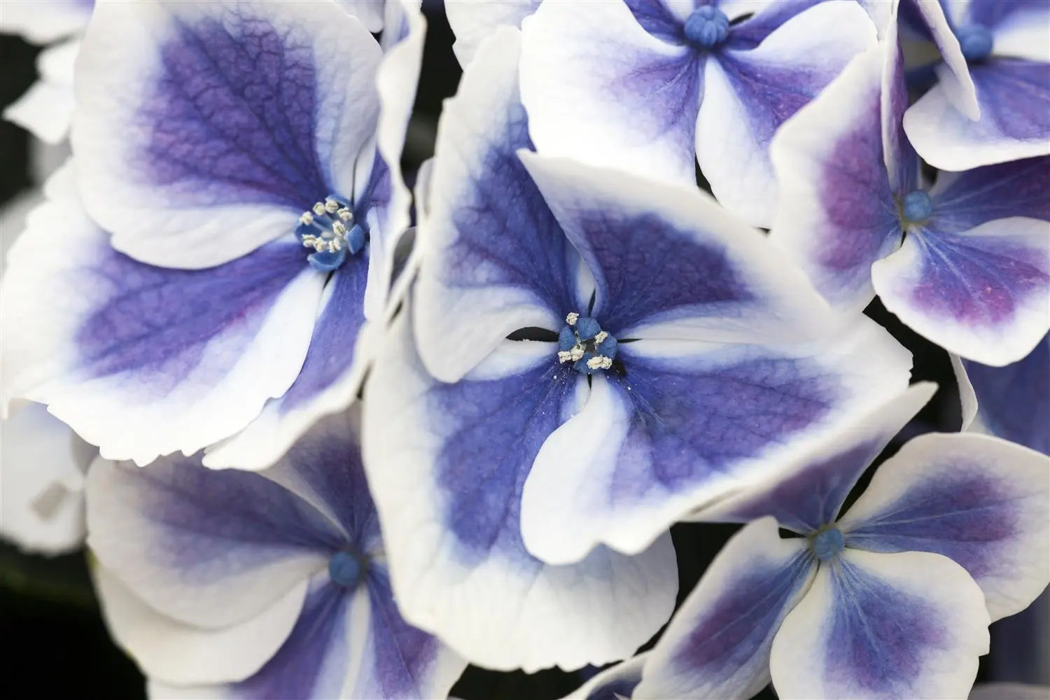 The blue-white, cupped flowers of the Common hydrangea 'Bavaria'® appear in umbels from June to September.