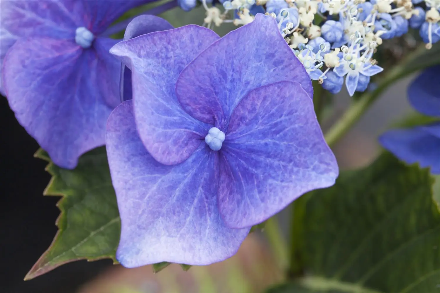 The blue, cupped flowers of the Common hydrangea 'Blaumeise' appear in umbels from June to September.