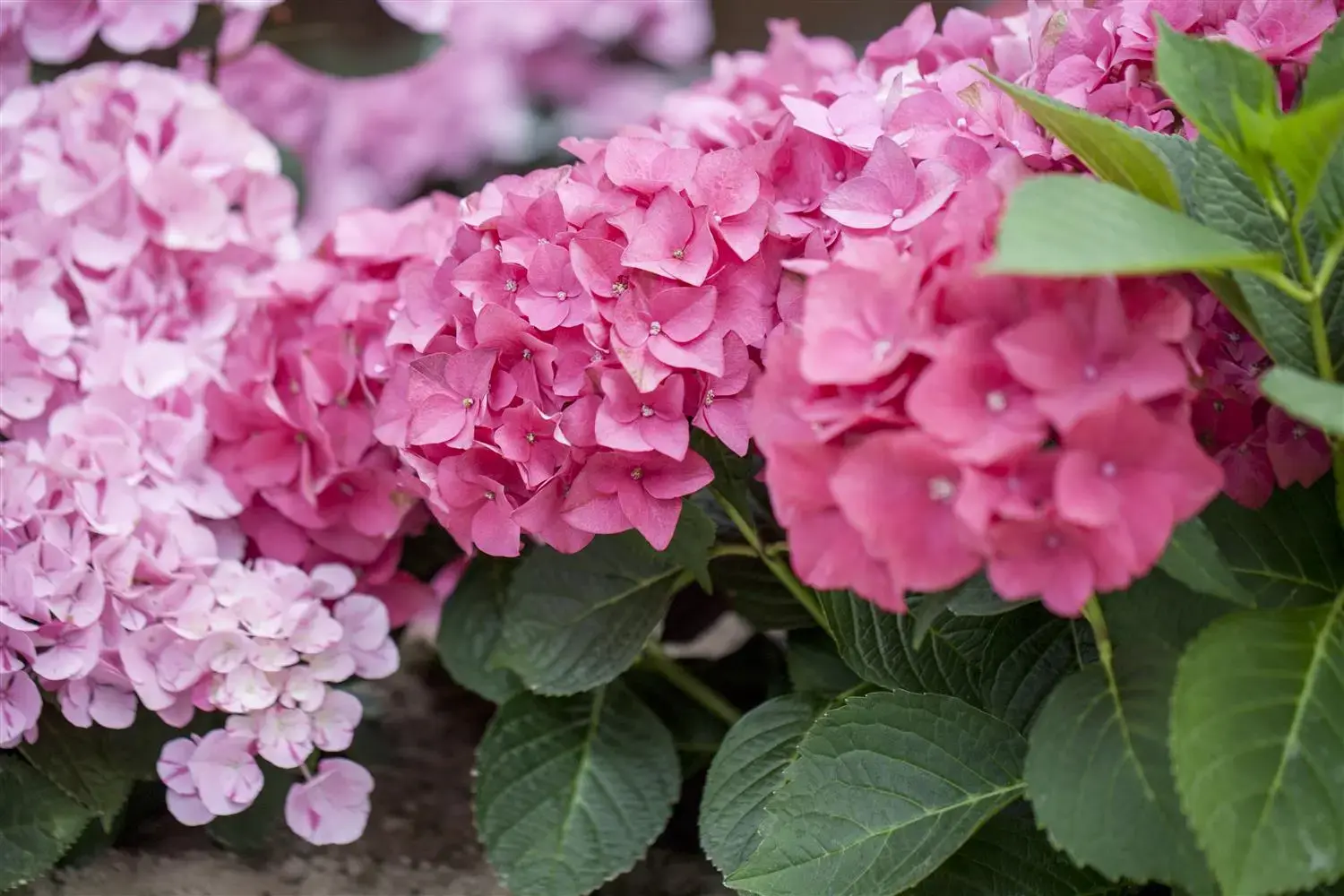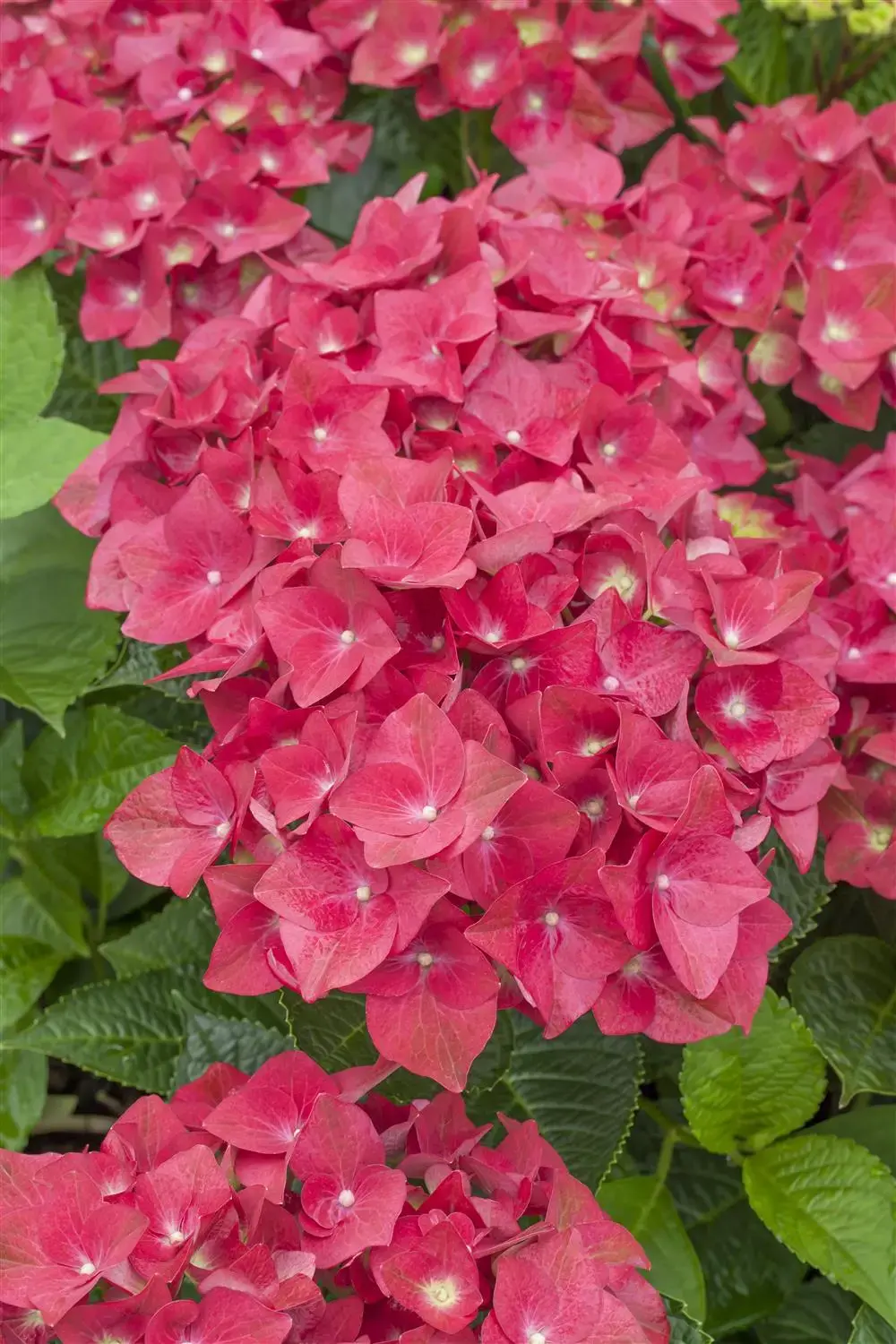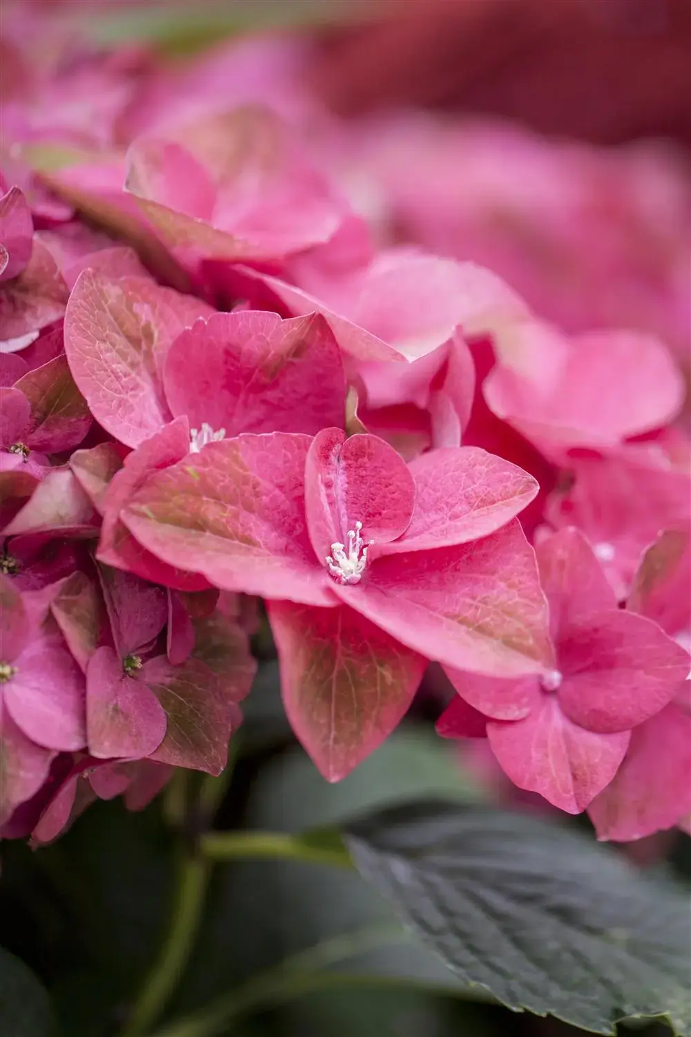 The Common hydrangea 'Green Shadow'(s) (Hydrangea macrophylla) is a bushy, upright, compact small shrub that produces pink-coloured, cupped flowers arranged in umbels. They appear from July to October. The Common hydrangea 'Green Shadow'(s) also has egg-shaped, medium-green leaves. In a semi-shady to shady location with humus-rich, weakly acidic soil, it usually reaches a height of approx. 1 m and is approx. 1 m wide.