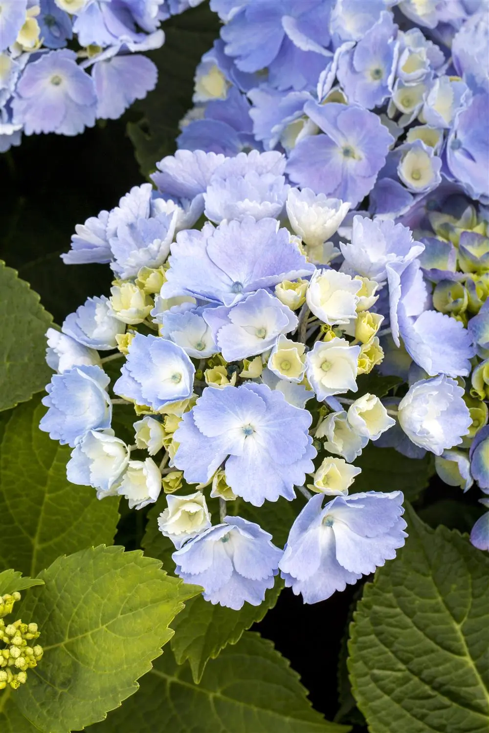 The blue, cupped flowers of the Common hydrangea 'Homigo'® appear in umbels from June to September.