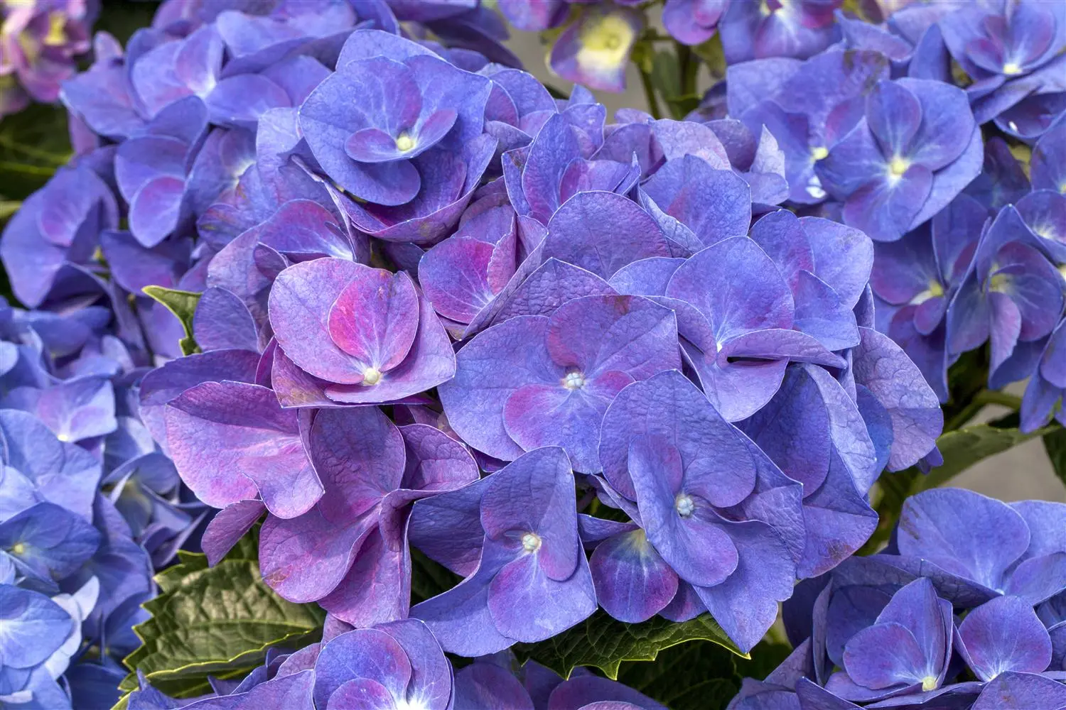 The Common hydrangea 'Jip Blue' (Hydrangea macrophylla) is a bushy, upright small shrub that produces blue-violet, cupped flowers arranged in umbels. They appear from June to September. The Common hydrangea 'Jip Blue' also has egg-shaped, dark green leaves. In a semi-shady to shady location with humus-rich, weakly acidic soil, it usually reaches a height of approx. 1.5 metres and grows to a width of approx. 1.5 metres.