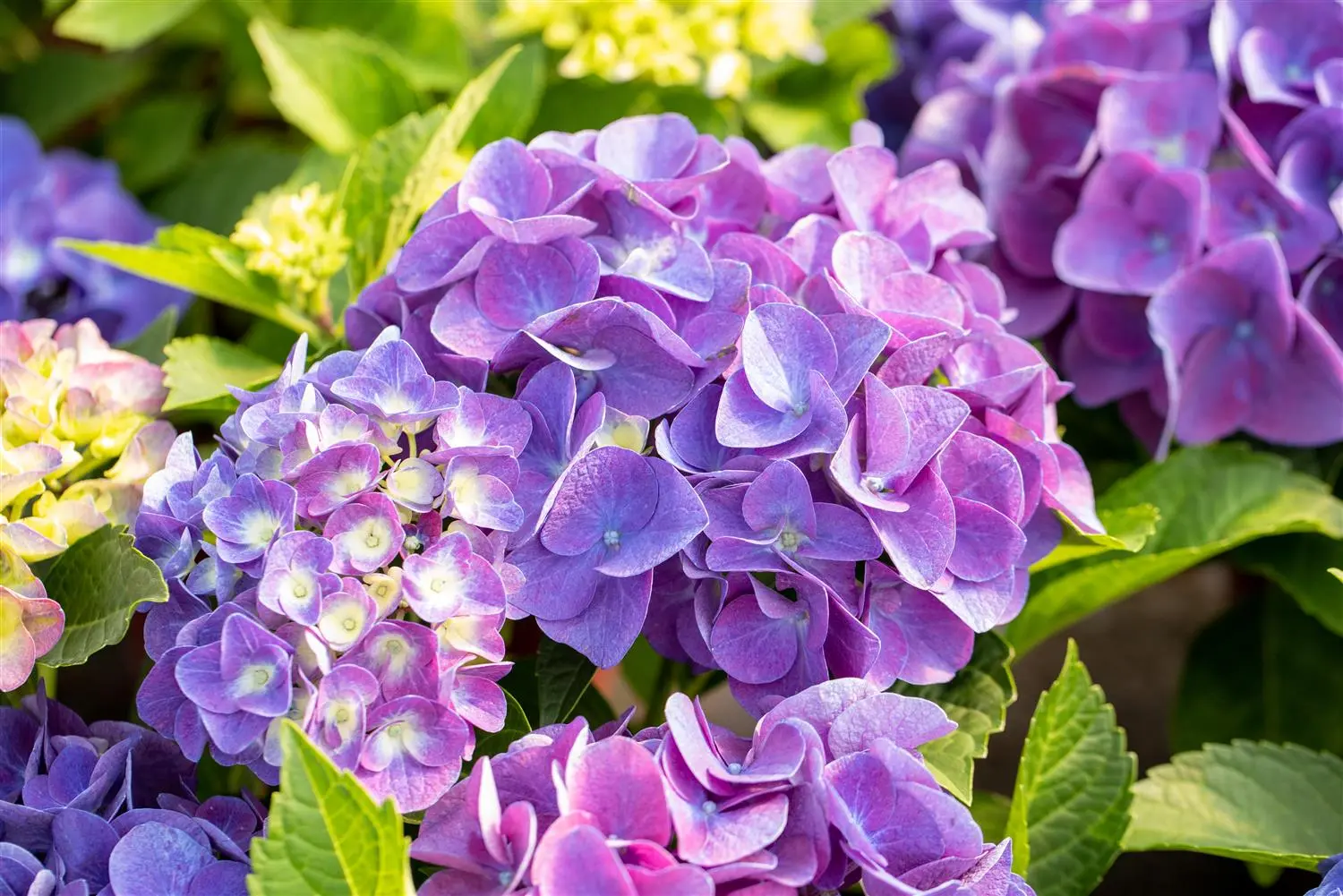 The blue-violet, cupped flowers of the Common hydrangea 'Jip Blue' appear in umbels from June to September.