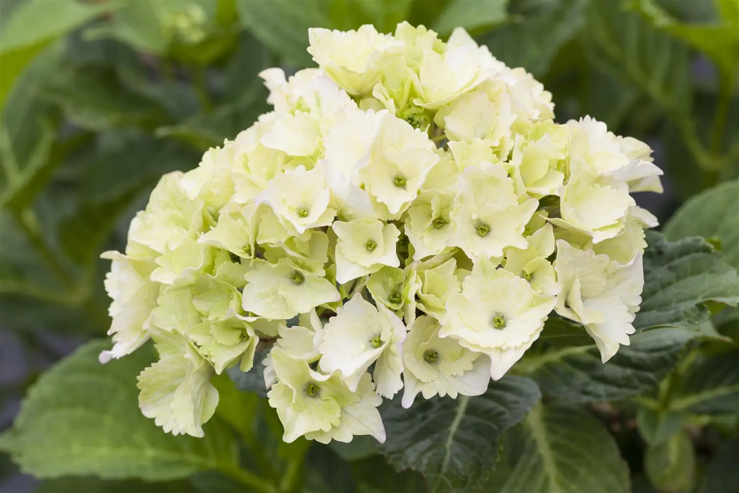 The green-white, cupped flowers of the Common hydrangea 'Magical Noblesse'® appear in umbels from May to November.