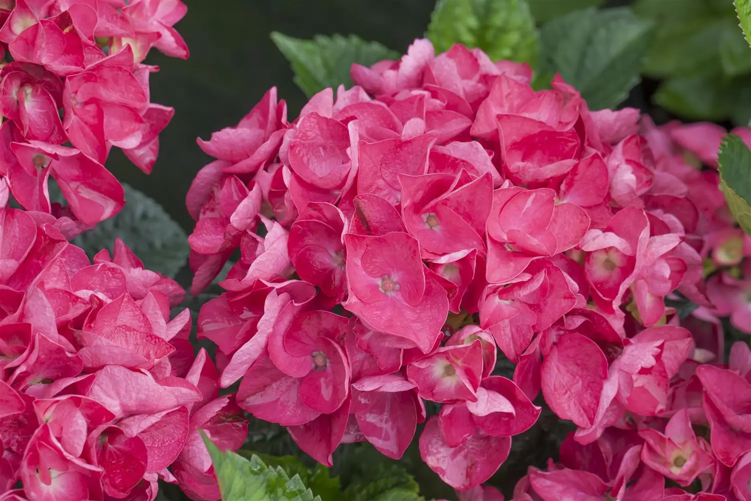 The Common hydrangea 'Merveille Sanguine' (Hydrangea macrophylla) is a bushy, upright small shrub that produces purple-red, cupped flowers arranged in umbels. They appear from June to September. The Common hydrangea 'Merveille Sanguine' also has egg-shaped, medium-green leaves. In a semi-shady to shady location with humus-rich, weakly acidic soil, it usually reaches a height of approx. 1.5 metres and grows to a width of approx. 1.5 metres.