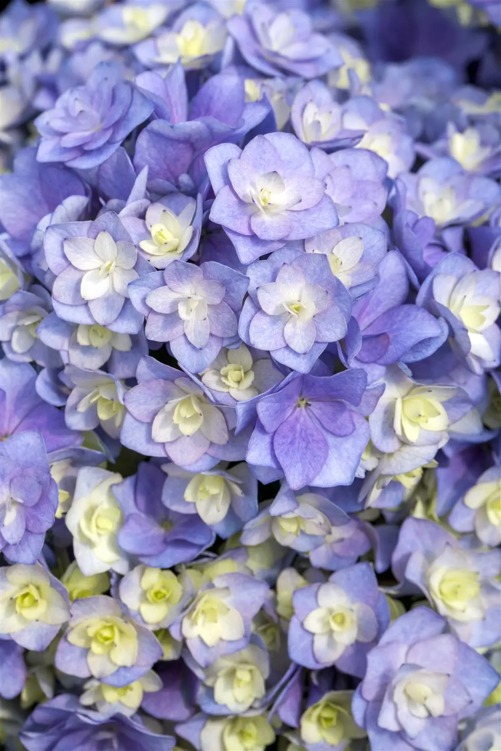 The blue, double, cupped flowers of the Common hydrangea 'Together'® appear in umbels from June to September.