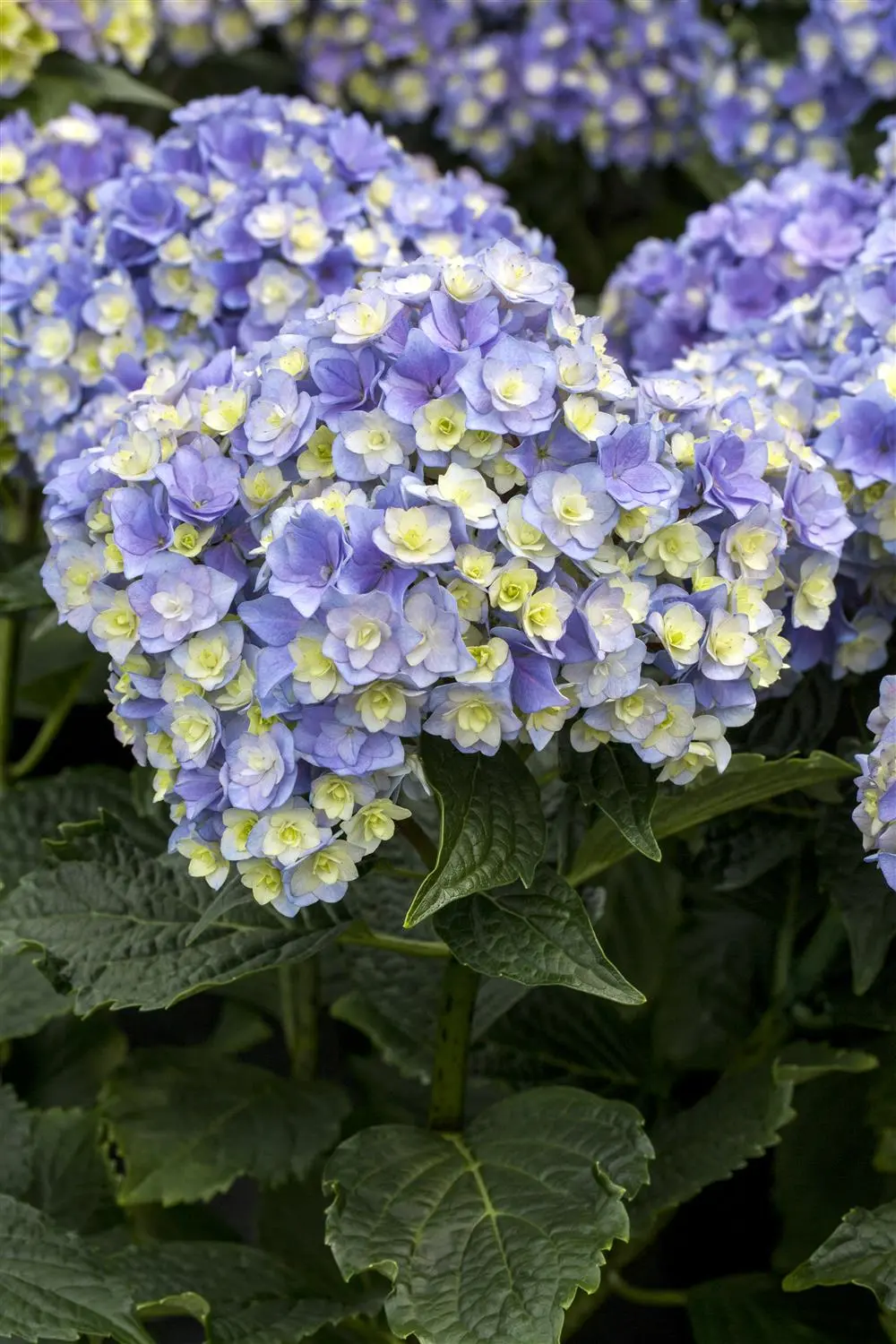 The Common hydrangea 'Together'® (Hydrangea macrophylla) is a bushy, upright small shrub that produces blue, cupped flowers arranged in umbels. They appear from June to September. The Common hydrangea 'Together'® also has egg-shaped, medium-green leaves. In a semi-shady to shady location with humus-rich, weakly acidic soil, it usually reaches a height of approx. 1 m and is approx. 1 m wide.