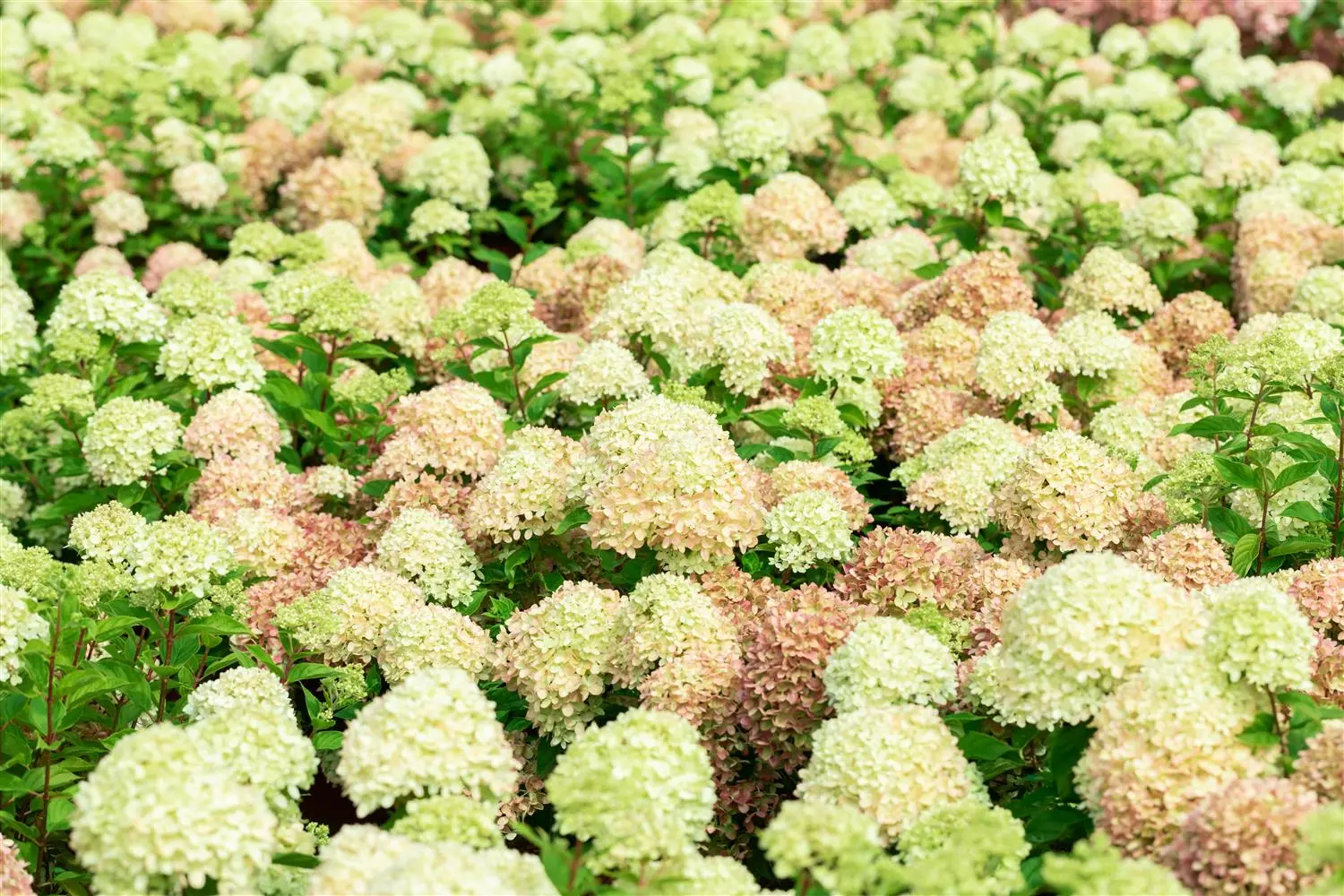 The Paniculate hydrangea 'Living Pinky Promise'® (Hydrangea paniculata) is an upright small shrub that produces white, later pink-coloured flowers arranged in panicles with a pleasant fragrance. They appear from the end of June to September. The Paniculate hydrangea 'Living Pinky Promise'® also has lanceolate, medium green leaves. In a sunny to semi-shady location with well-drained, humus-rich soil, it usually reaches a height of approx. 70 cm and is approx. 80 cm wide.