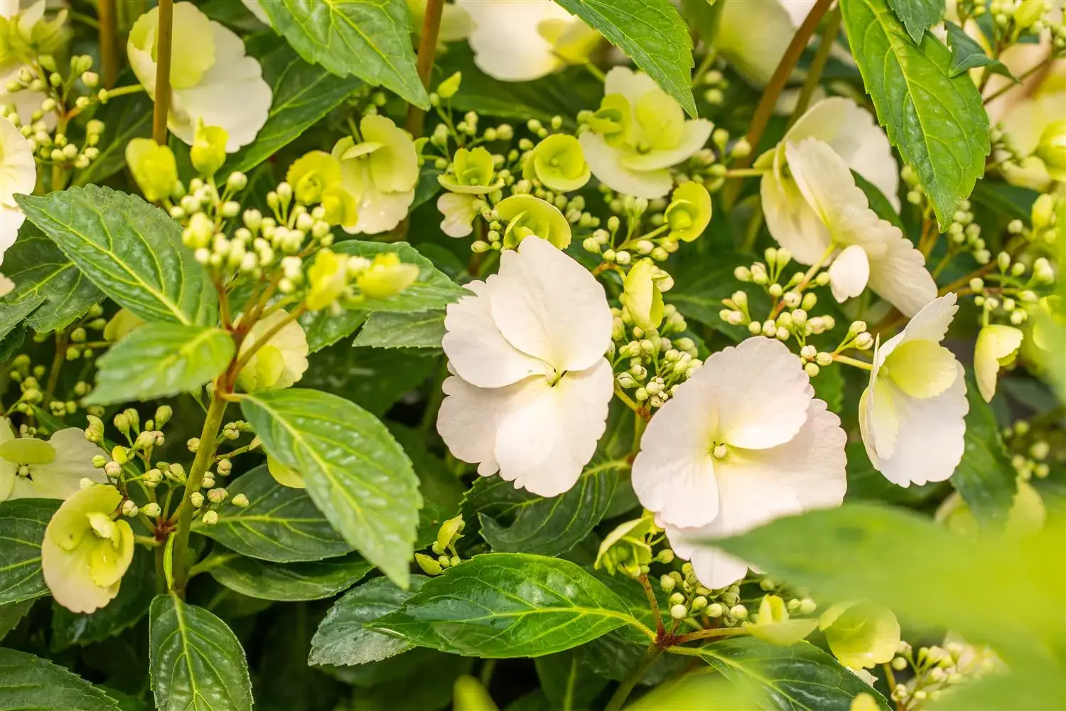 The white, cupped flowers of the Common hydrangea 'Runaway Bride'® appear in umbels from June to September.