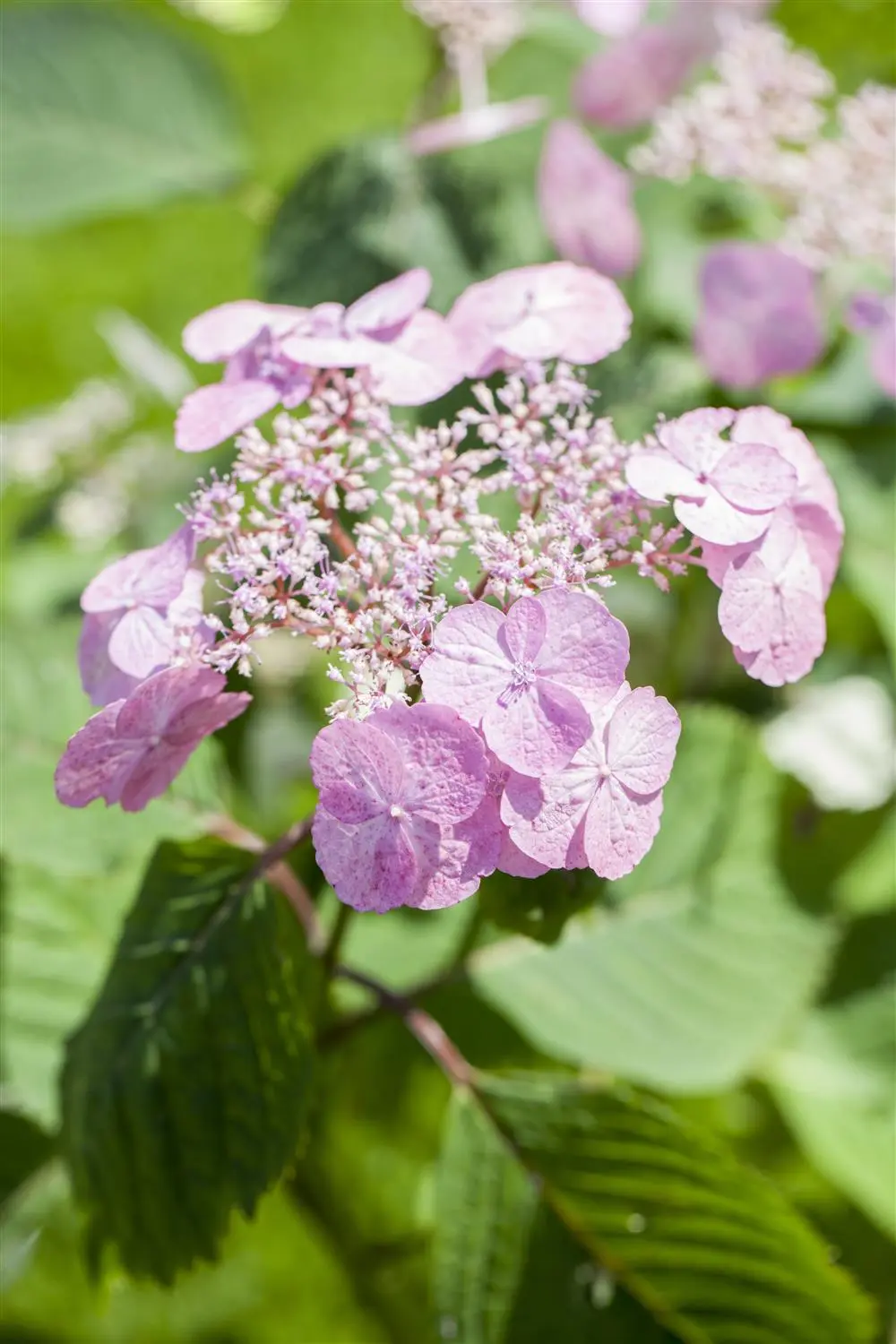 The light blue flowers of the Saw-toothed hydrangea 'Veerle' appear in umbels from July to October.