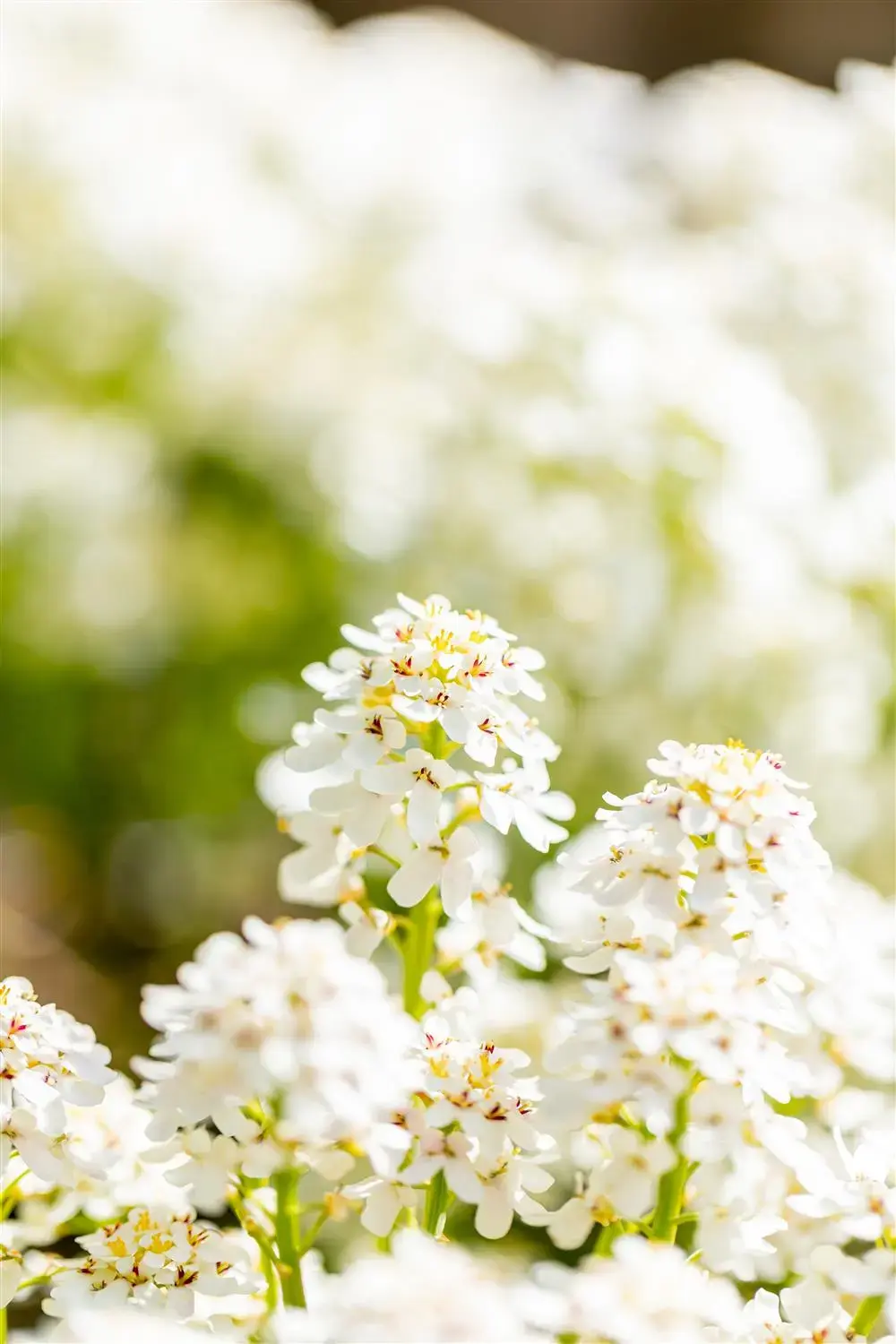 The Perennial candytuft 'Fischbeck' (Iberis sempervirens) is a cushion-shaped, compact, evergreen perennial that forms white flowers arranged in umbels from April to May. Its lanceolate leaves are grey-green. In a sunny location with well-drained, nutrient-rich soil, it usually reaches a height of approx. 25 cm and grows to a width of approx. 40 cm. The Perennial candytuft 'Fischbeck' is well tolerant of frost.