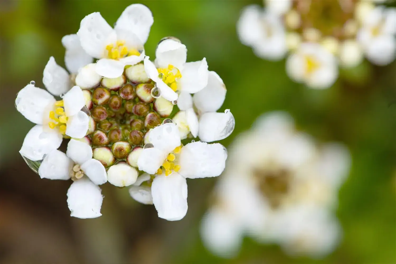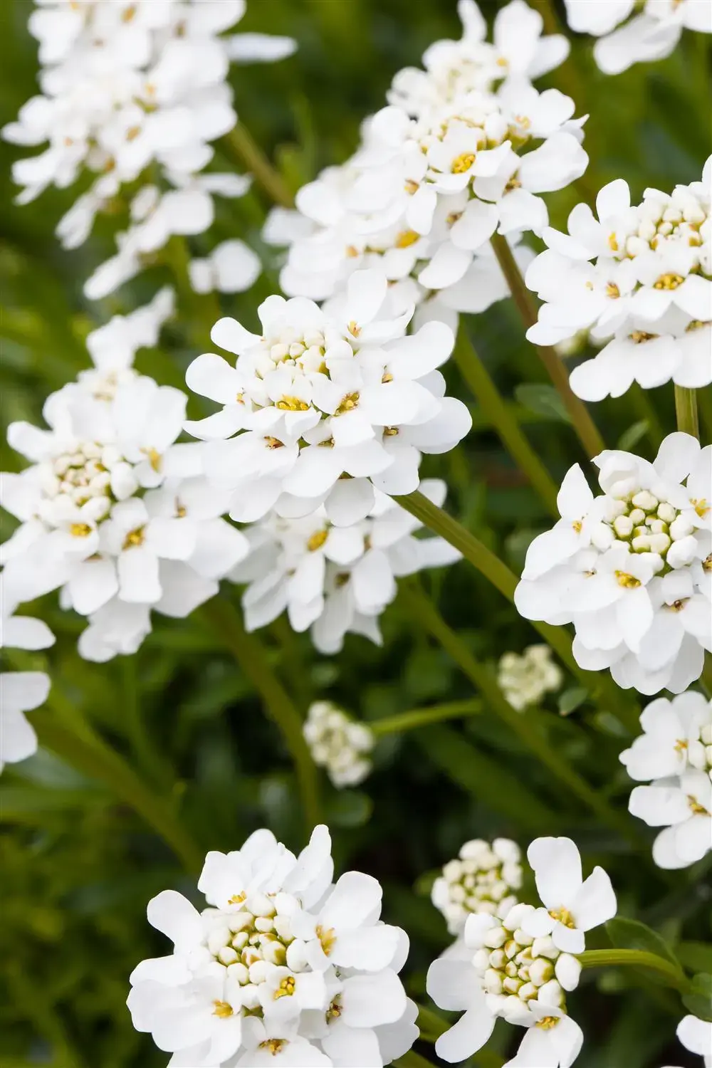 Iberis sempervirens 'Schneeflocke' forms white flowers arranged in umbels from April. These grow to about 3 - 4 cm in size.