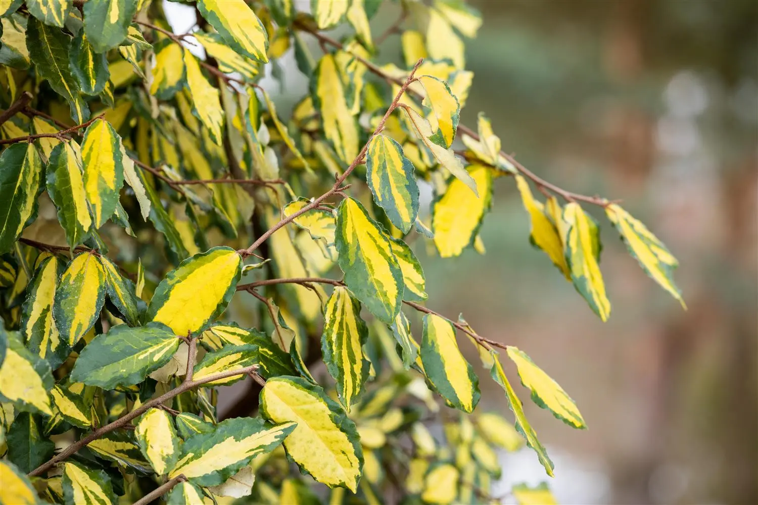 High leaf ornamental value. The evergreen leaves of the Common holly 'Golden van Tol' are dark green, lanceolate, roundish, glossy, alternate, toothed and have a yellow margin. They are about 3 - 8 cm in size.