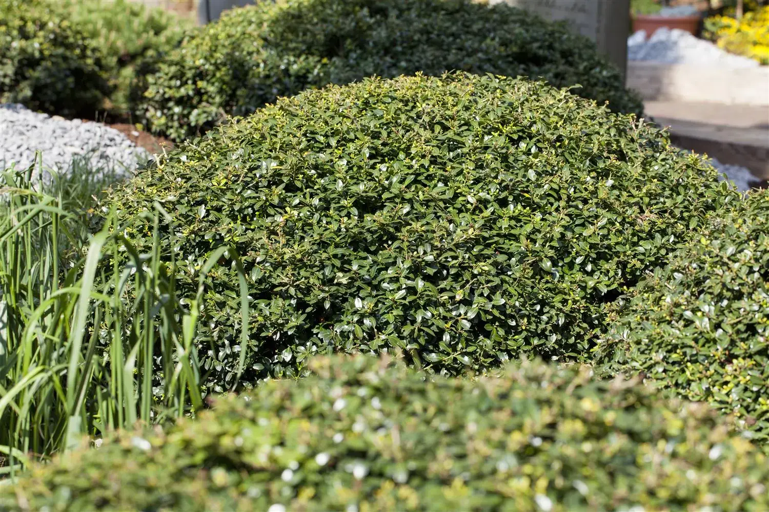 The Japanese holly 'Green Lustre' (Ilex crenata) is a broad, dense small shrub with decorative, black fruits. It produces creamy white flowers from May to June. The Japanese holly 'Green Lustre' also has roundish, dark green leaves. In a sunny to semi-shady location with well-drained, loose, weakly acidic soil, it usually reaches a height of approx. 1.5 metres and grows to a width of approx. 2.5 metres.