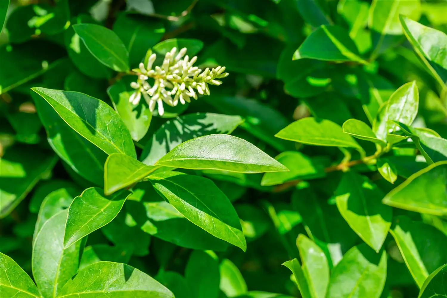 The California privet 'Green Diamond'® (Ligustrum ovalifolium) is an upright, slender small shrub that produces creamy white flowers with a strong fragrance. They appear from June to July. They produce black, round fruits from September. They exude a strong fragrance. The California privet 'Green Diamond'® also has shiny, egg-shaped, dark green leaves. In a sunny to semi-shady location with well-drained, humus-rich, nutrient-rich soil, it usually reaches a height of approx. 1.5 metres and grows to a width of approx. 1.5 metres.