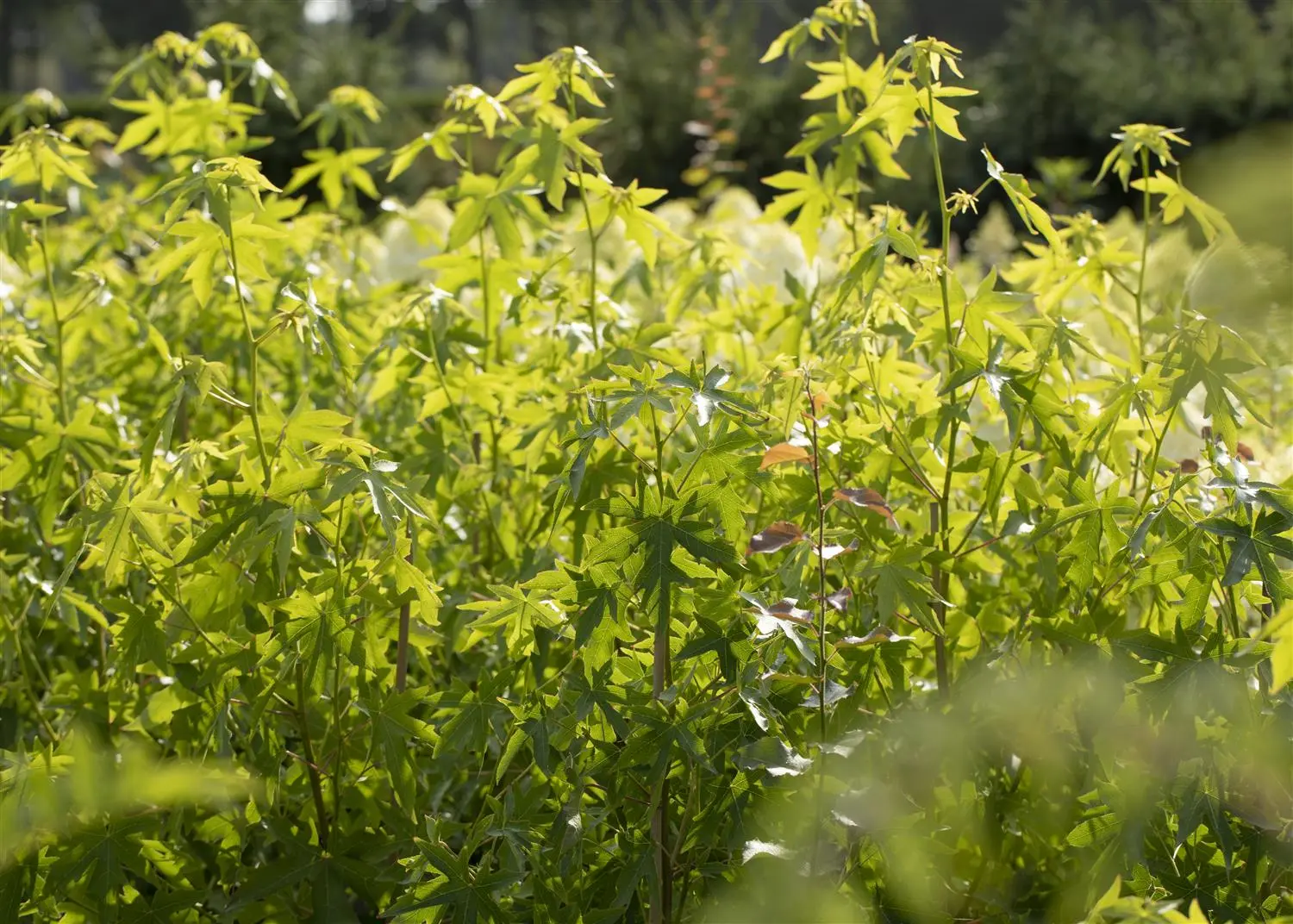 The Sweet gum 'Worplesdon' (Liquidambar styraciflua) is a conical, upright tree with decorative, brown, round fruits that remain on the tree for a very long time. In May, it produces greenish-yellow flowers arranged in spikes. The Sweet gum 'Worplesdon' also bears deeply slit, medium green leaves. In a sunny location with lime-free, nutrient-rich, weakly acidic soil, it usually grows to a height of around 15 metres and is around 8 metres wide.