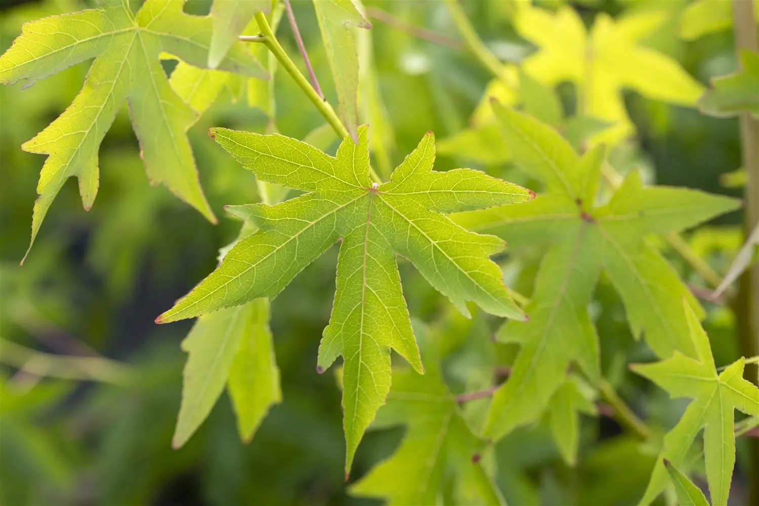 The deciduous leaves of the Sweet gum 'Worplesdon's are medium green, deeply slit, alternate. They are about 12 - 15 cm tall. Sweet gum 'Worplesdon' is bright dark red to red-orange in autumn.