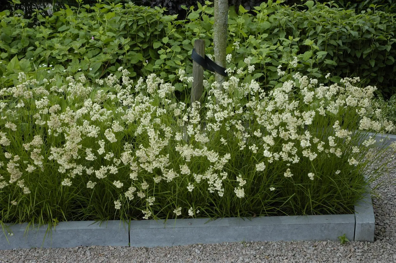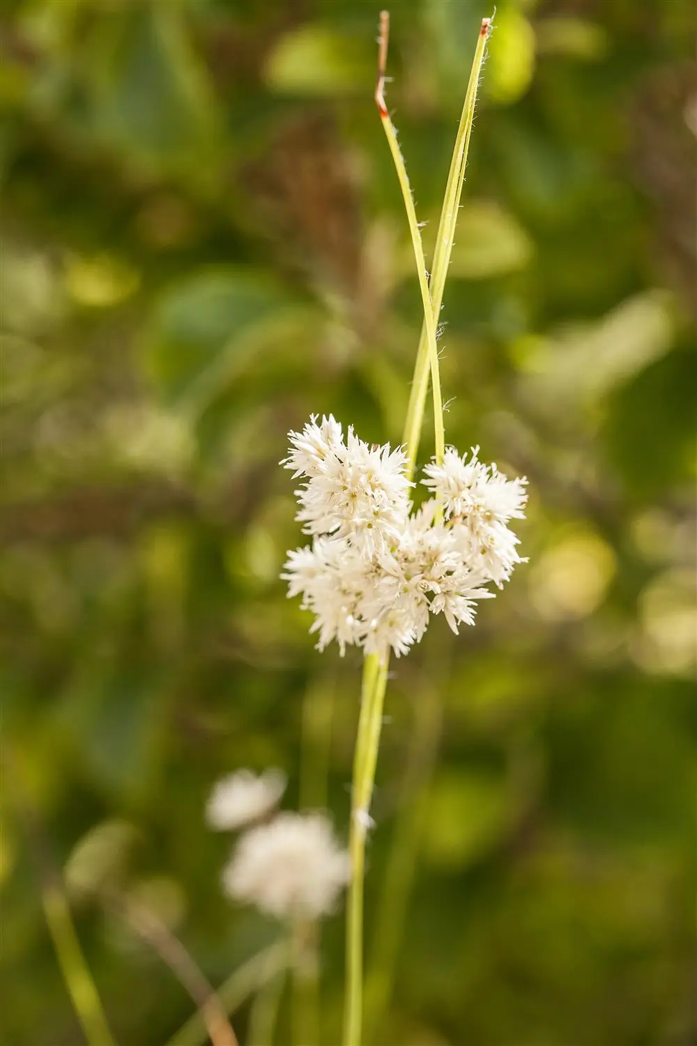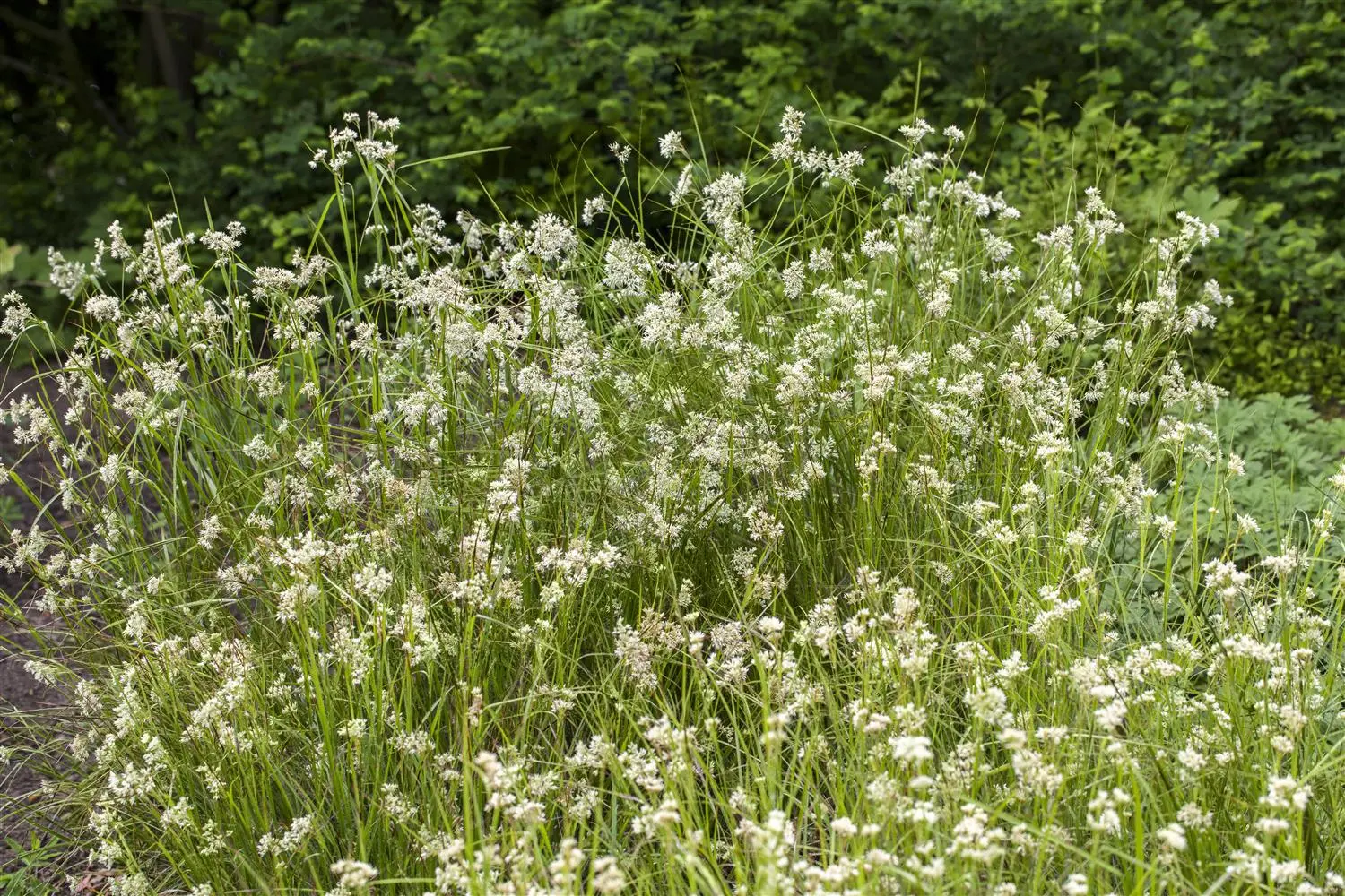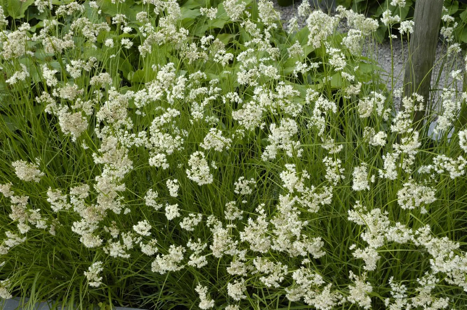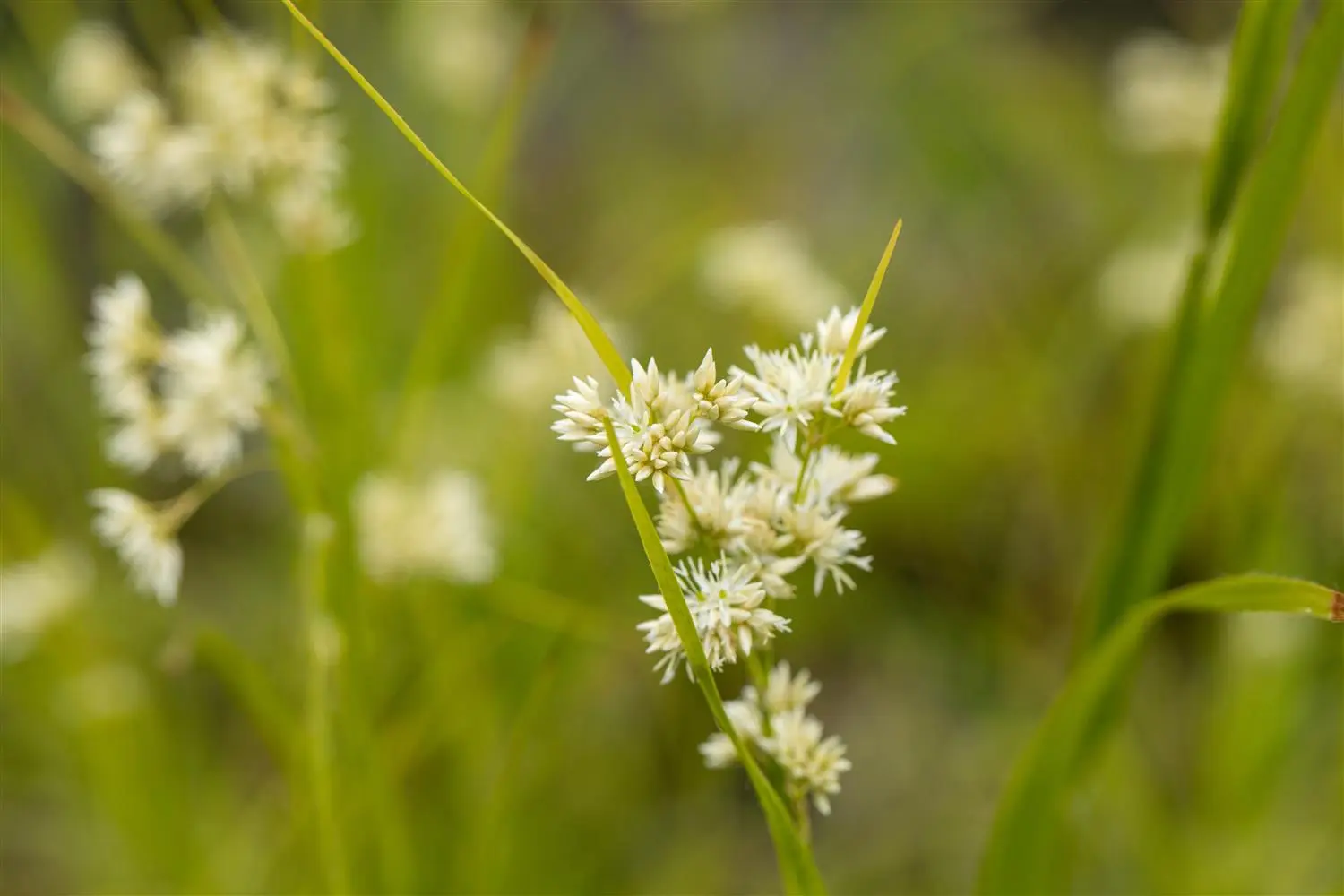 The white flower umbels adorn this grass from summer onwards. In favourable conditions, this hardy grass reaches a height of approx. 20 cm and grows up to 20 cm wide.