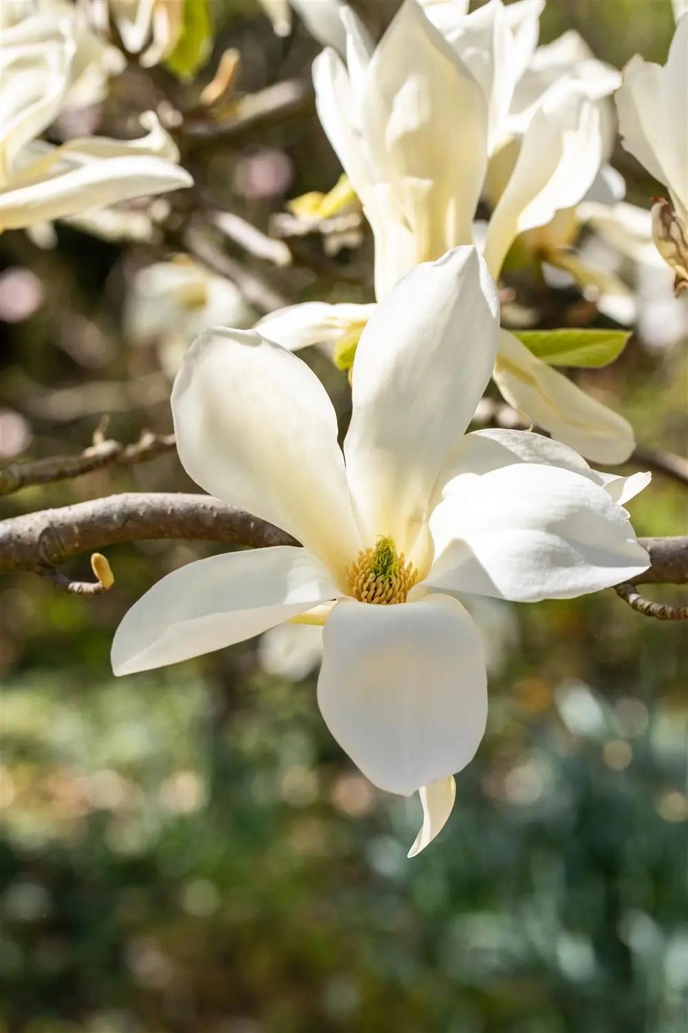 The Magnolia 'Fairy White'® (Magnolia) is an upright garden plant that produces white flowers with a pleasant fragrance. They appear from March to April. The Magnolia 'Fairy White'® also has dark green leaves. In a sunny to semi-shady, wind-protected location with humus-rich, lime-free, sandy soil, it usually reaches a height of approx. 2.5 m and is approx. 2 m wide.