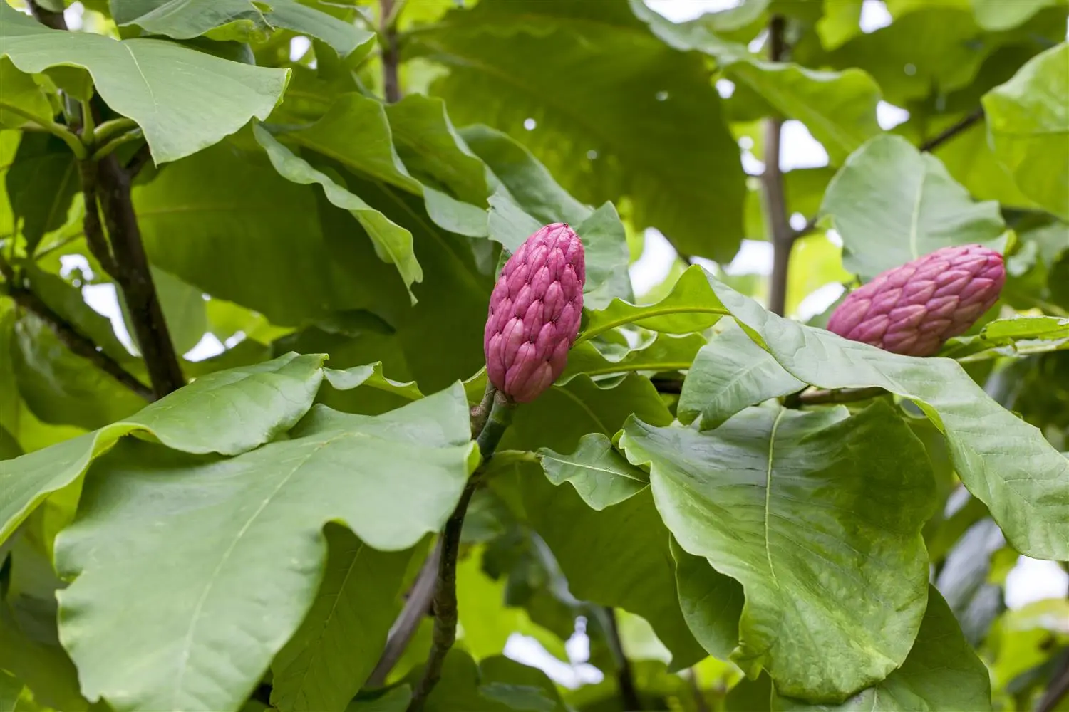 The pink-coloured, cone-shaped fruits of Magnolia tripetala are particularly decorative.