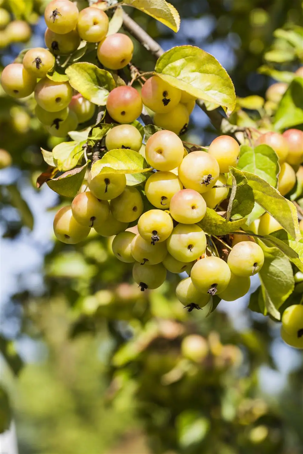 The yellow, round fruits of Malus 'Butterball' are particularly decorative. These appear from October. Sticks for a very long time.