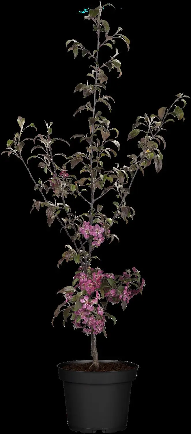 The Apple 'Coccinella'® (Malus) is a large, conical, deciduous shrub with decorative, egg-shaped, purple-red leaves. It also bears purple-violet, bowl-shaped flowers in May. These produce dark red, round fruits. In a sunny location with humusy, loose, nutrient-rich, weakly acidic soil, it usually reaches a height of around 7 metres and grows to a width of around 6 metres.