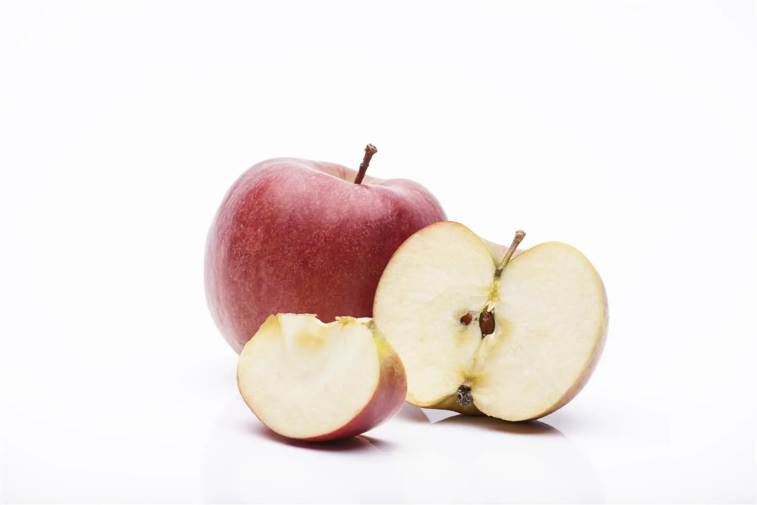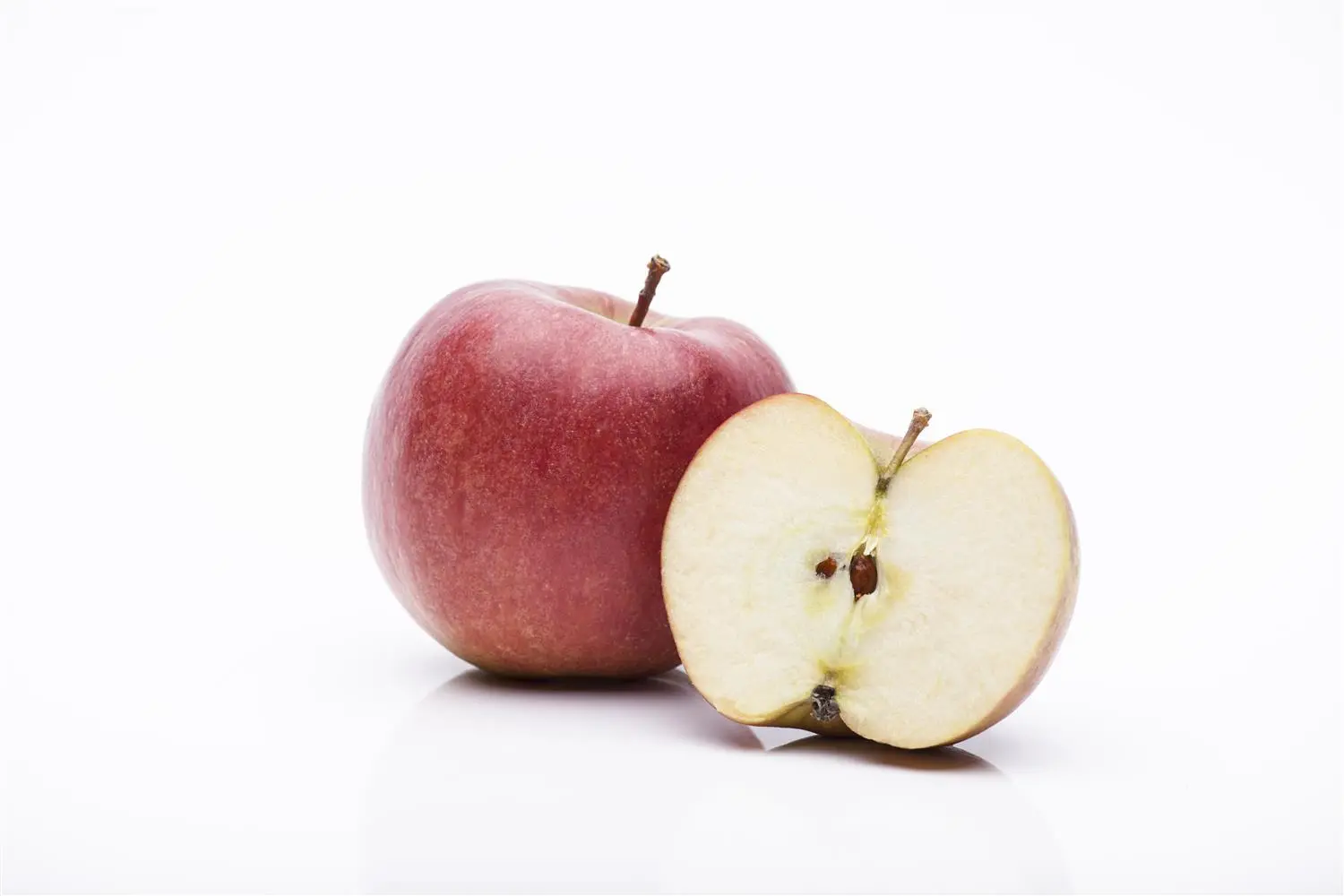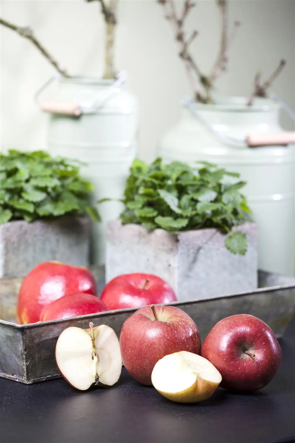 The Apple 'Braeburn' (Malus domestica) produces yellow-red, large, firm fruits. They have a sweet and sour flavour. Well-drained, nutrient-rich soil and a sunny to semi-shady location create the ideal conditions for a high-yield harvest from October. Its light pink flowers are a beautiful sight. With its upright and broad growth, the Apple 'Braeburn' grows to around 4 metres high and 3 metres wide.
